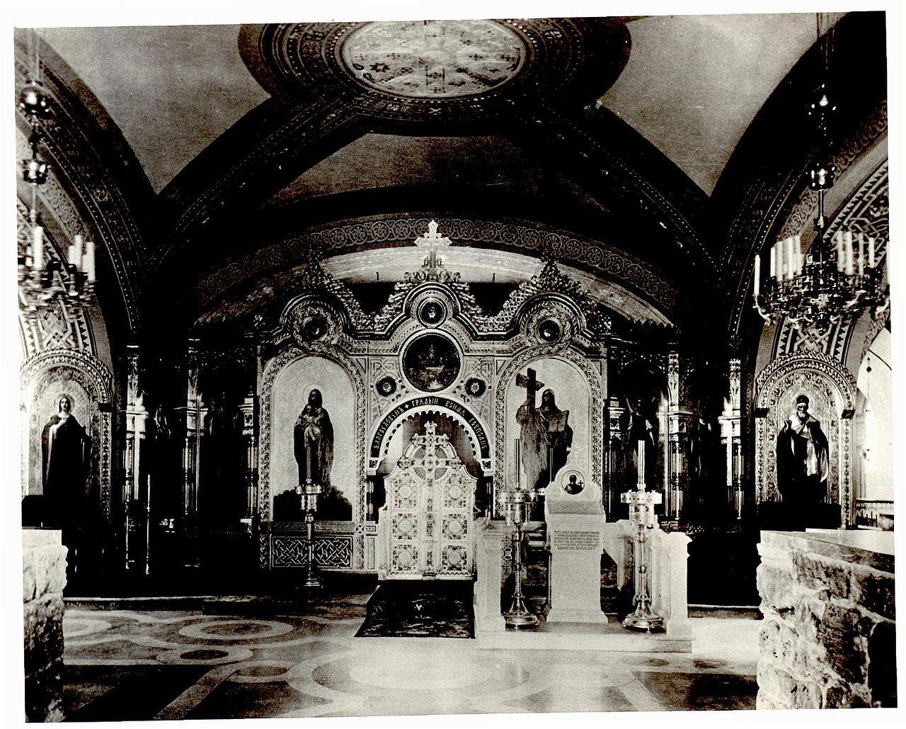 Если присмотреться, то на архивных фотографиях хорошо видны остатки стен древней церкви, которая, и есть та самая церковь, в которой крестили святого Владимира. Остатки древних стен не стали сносить. И новый храм возвели вокруг них.