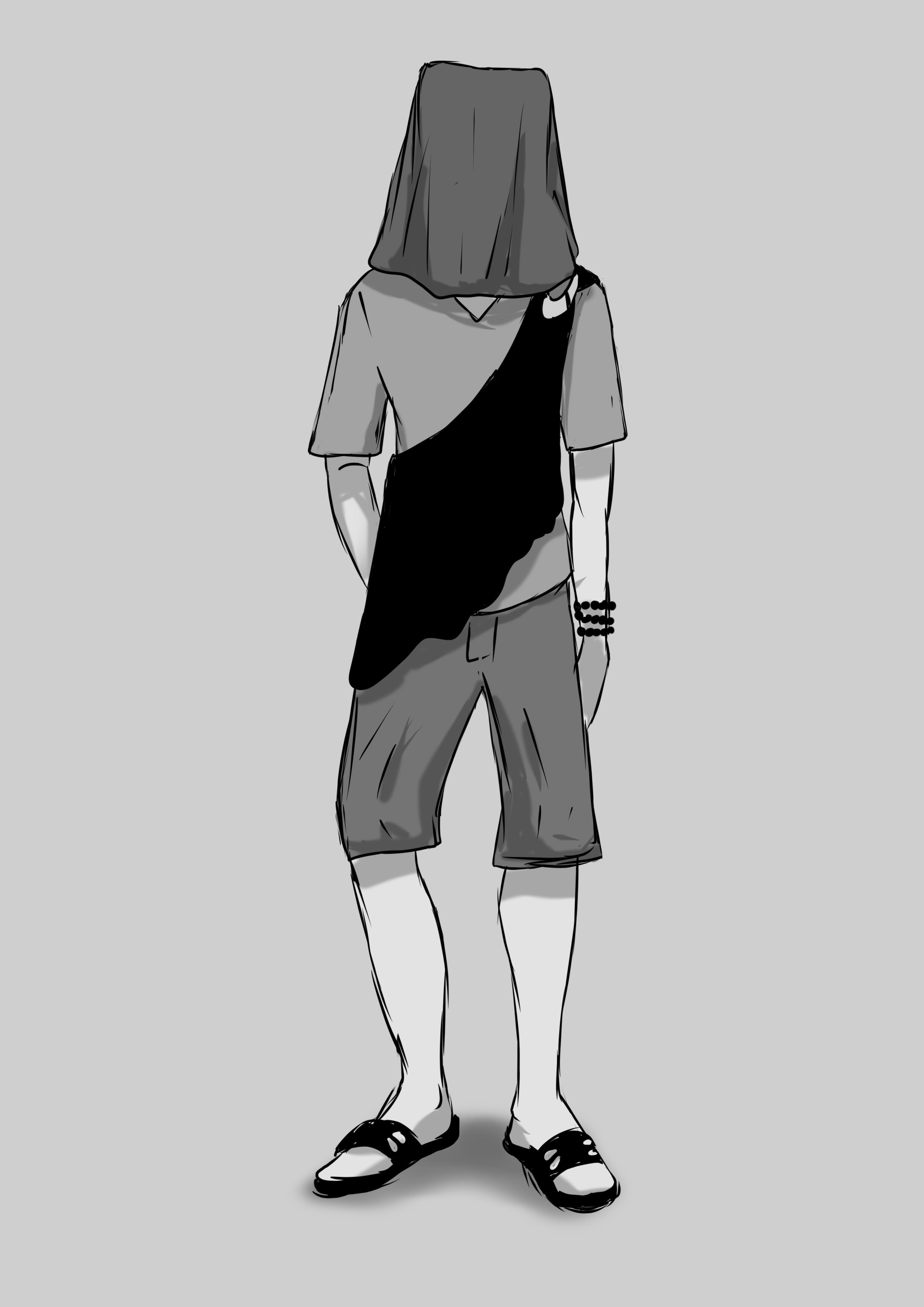 А это концепт протагониста. На протяжении всего произведения он ни разу не назовёт своё имя, так что нам неизвестно как его зовут. На левой руке у него буддийские чётки, накрученные трижды, а также мы можем видеть на нём нечто, вроде дзен-буддийской накидки, правда старой и изодранной.