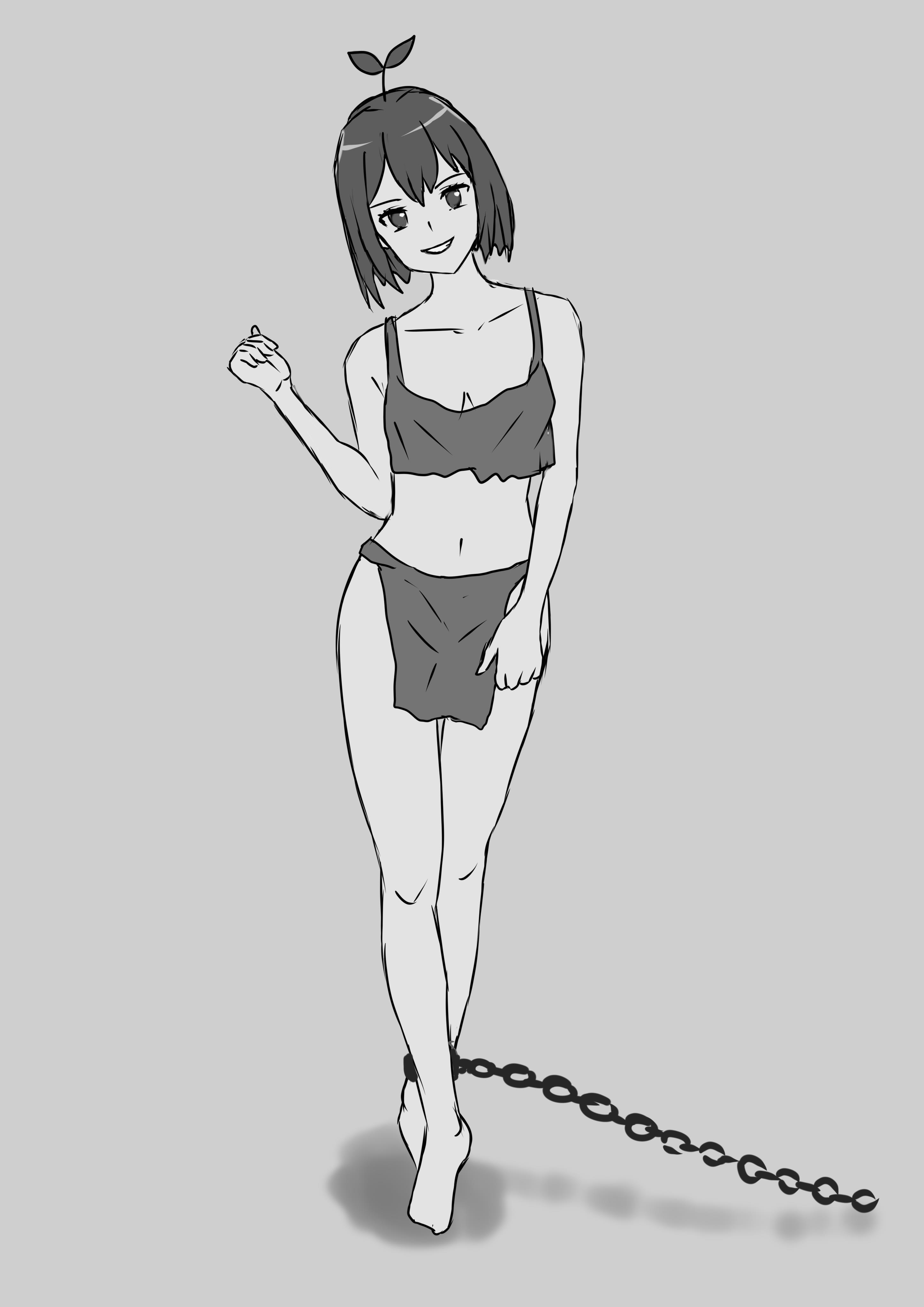 Девочка, изображённая здесь, это дейтерагонист (второй протагонист). У неё будут зелёные волосы, красные глаза, из макушки растут два листочка, на ней старая, разваливающаяся от времени рвань, а на ноге кандалы, цепью приковывающие её к скале на морском берегу, девочка не может покинуть место своего обитания.