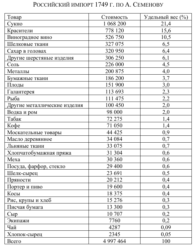 Как можно видеть предметы роскоши среди импорта составляли ничтожный процент, а основными предметами ввоза были "товары народного потребления" (сукно, хлопковые ткани..), а также сырье для производства (красители, пряжа, шелк и хлопок сырец).