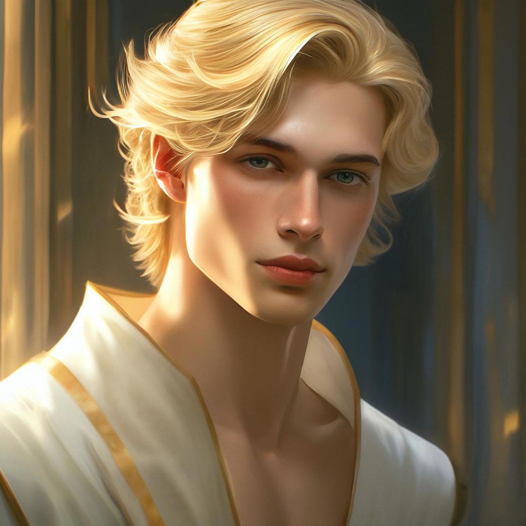 "...Коротко остриженные, очень светлые, пшеничного цвета волосы молодого человека слегка завивались на концах. Глаза, сами по себе насыщенного голубого цвета, при имени жены всегда озарялись красивыми золотистыми лучиками. Он был высокого роста, статен и обладал поистине царственной осанкой, которую не могла скрыть даже нарочито простая одежда повседневного стиля.