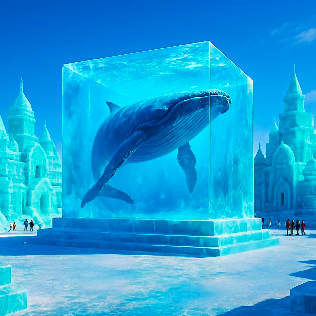 Автор: Михаил ПоляковВ центре городской площади, окружённой великолепными ледяными зданиями, возвышался величественный монумент. Идеально ровный куб льда, казалось, вырос из самого сердца города. В его кристальной толще, в вечном покое, застыл кит. Огромный, он парил внутри, словно продолжая свой путь в бескрайних океанских глубинах.