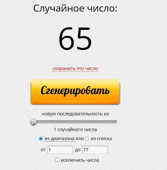Запускаем онлайн-генератор случайных чисел. На "барабане" высвечивается данное число.