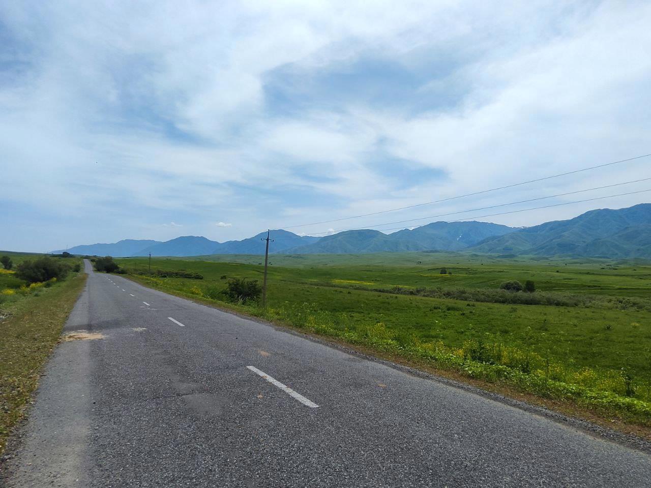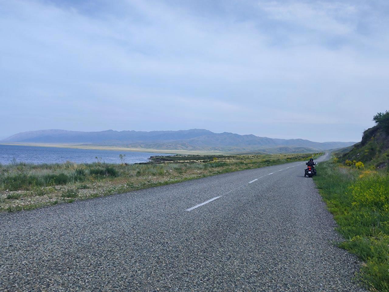 «Не лучшего качества» оказалось прям комплиментом. Местами ямы были такие, что спрятаться там можно было вместе с мотоциклом, но как по мне – оно того стоило. Медленно, но очень живописно – отличная альтернатива для тех, кто не торопится. Кусок с Ушбулака вниз до Алаколя вообще вполне приличный, а до этого нам встретилась техника и снятый асфальт – так что возможно в обозримой перспективе хорошая дорога будет и там.