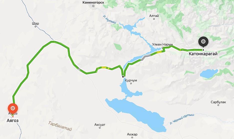 Гулять и добывать еду пришлось как есть, в естественной грязевой маскировке. Благо, воду к нашему возвращению в отель всё же дали, и помыться перед сном получилось. Наутро нас ждал довольно длинный перегон длиной 600 километров сразу до Катон Карагая. Но не через Усть-Каменогорск, а через Кокпекты и свежепостроенный мост через Иртыш.