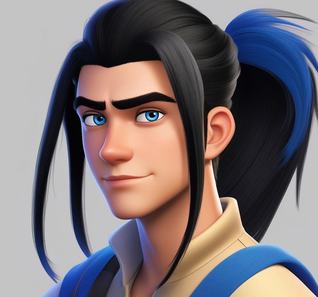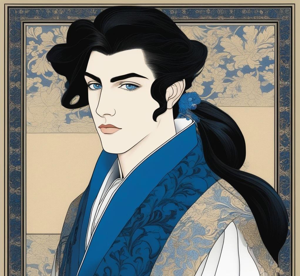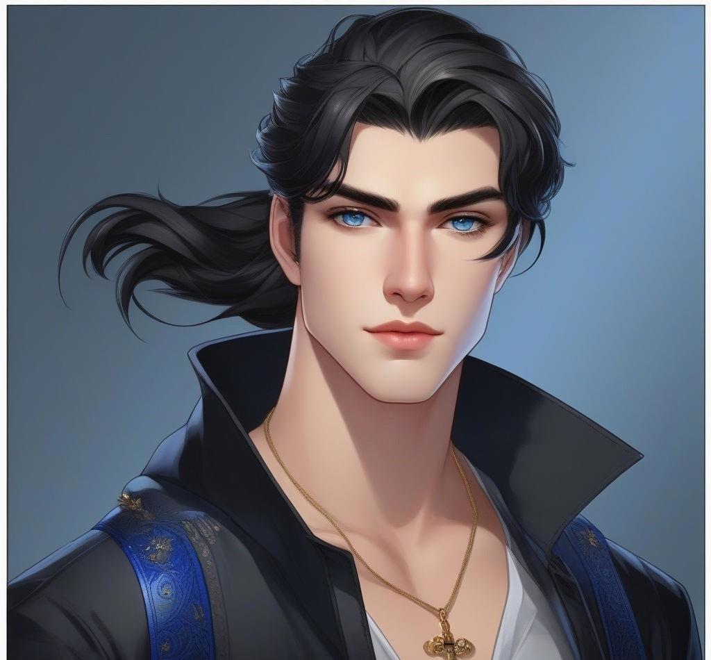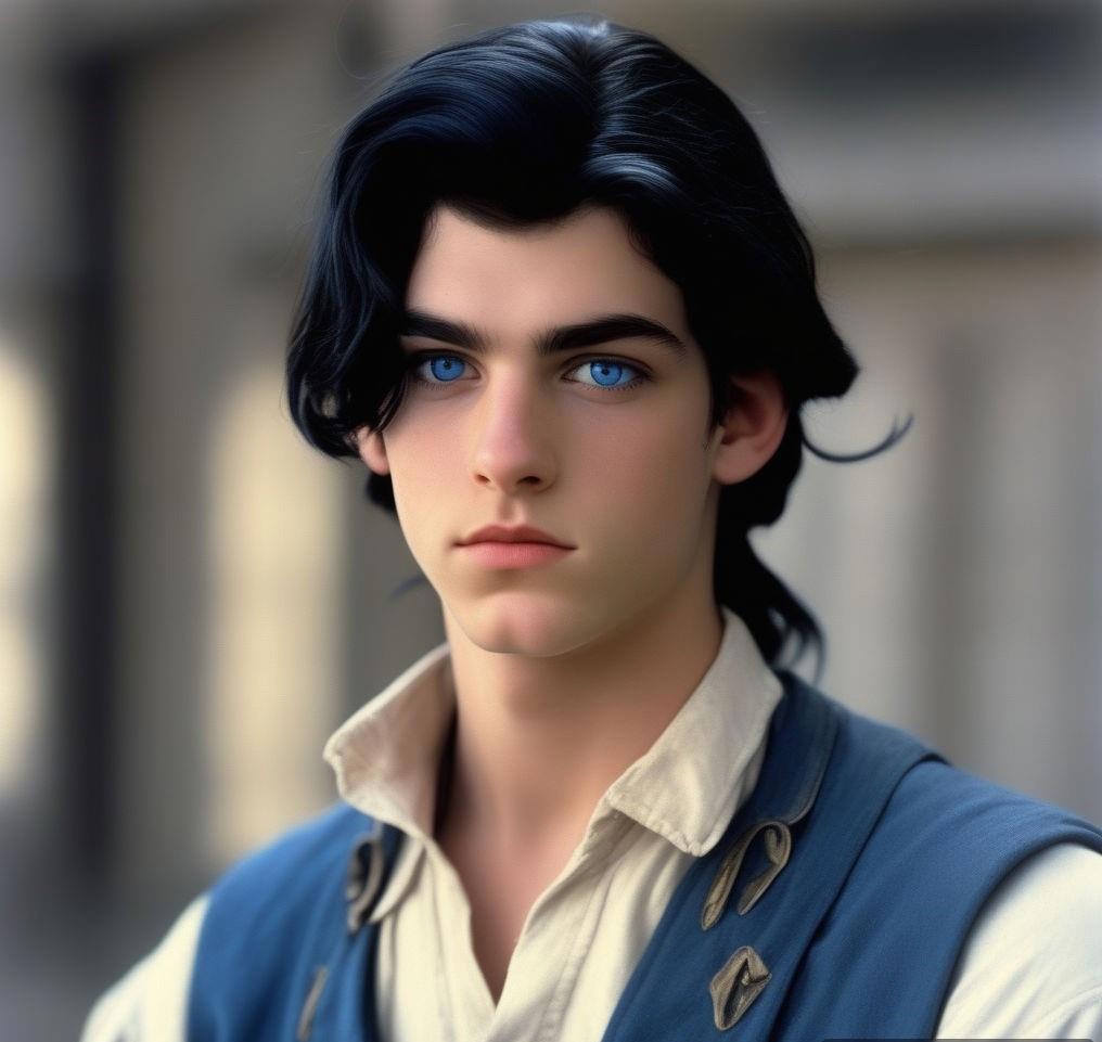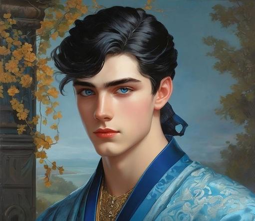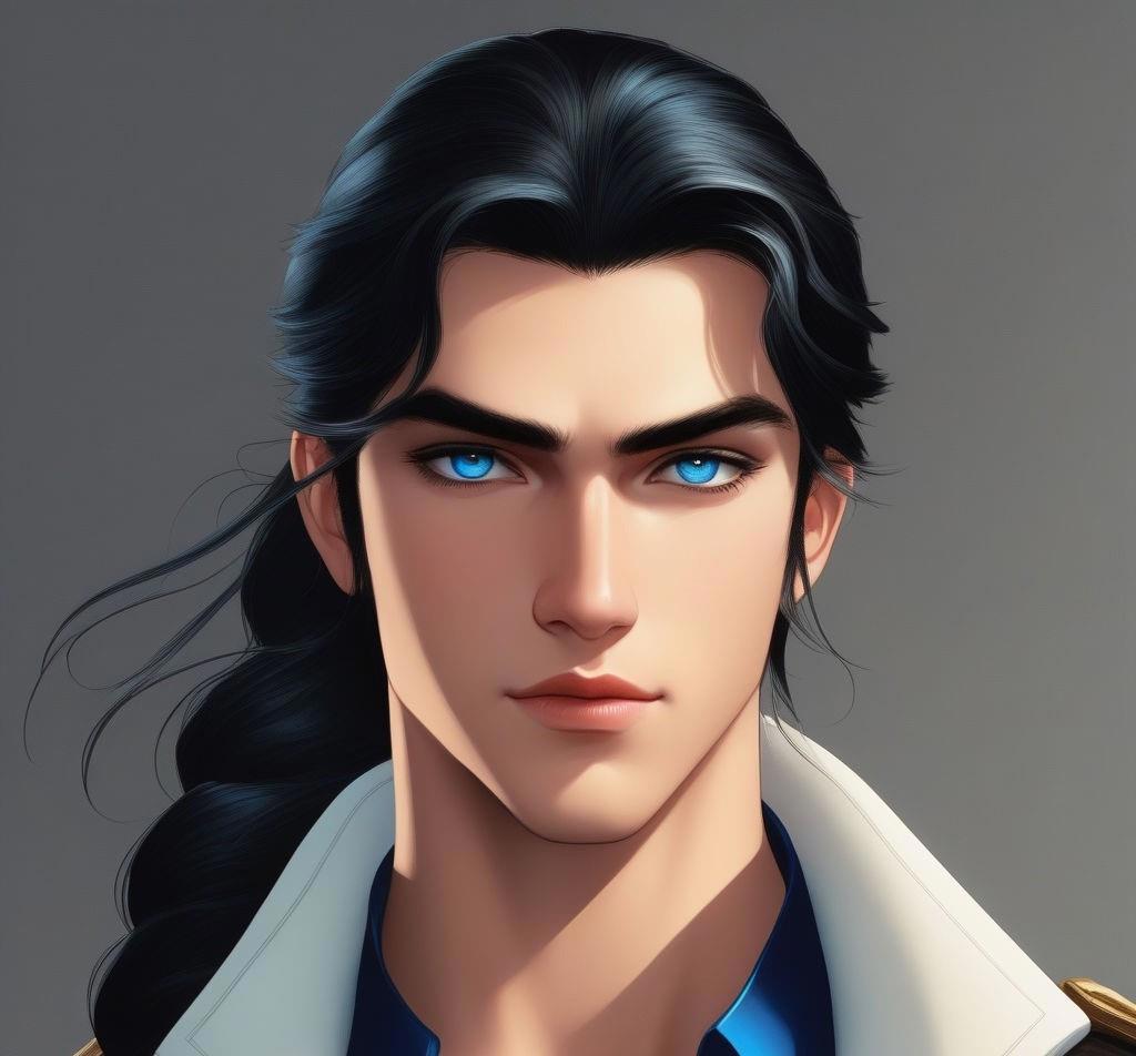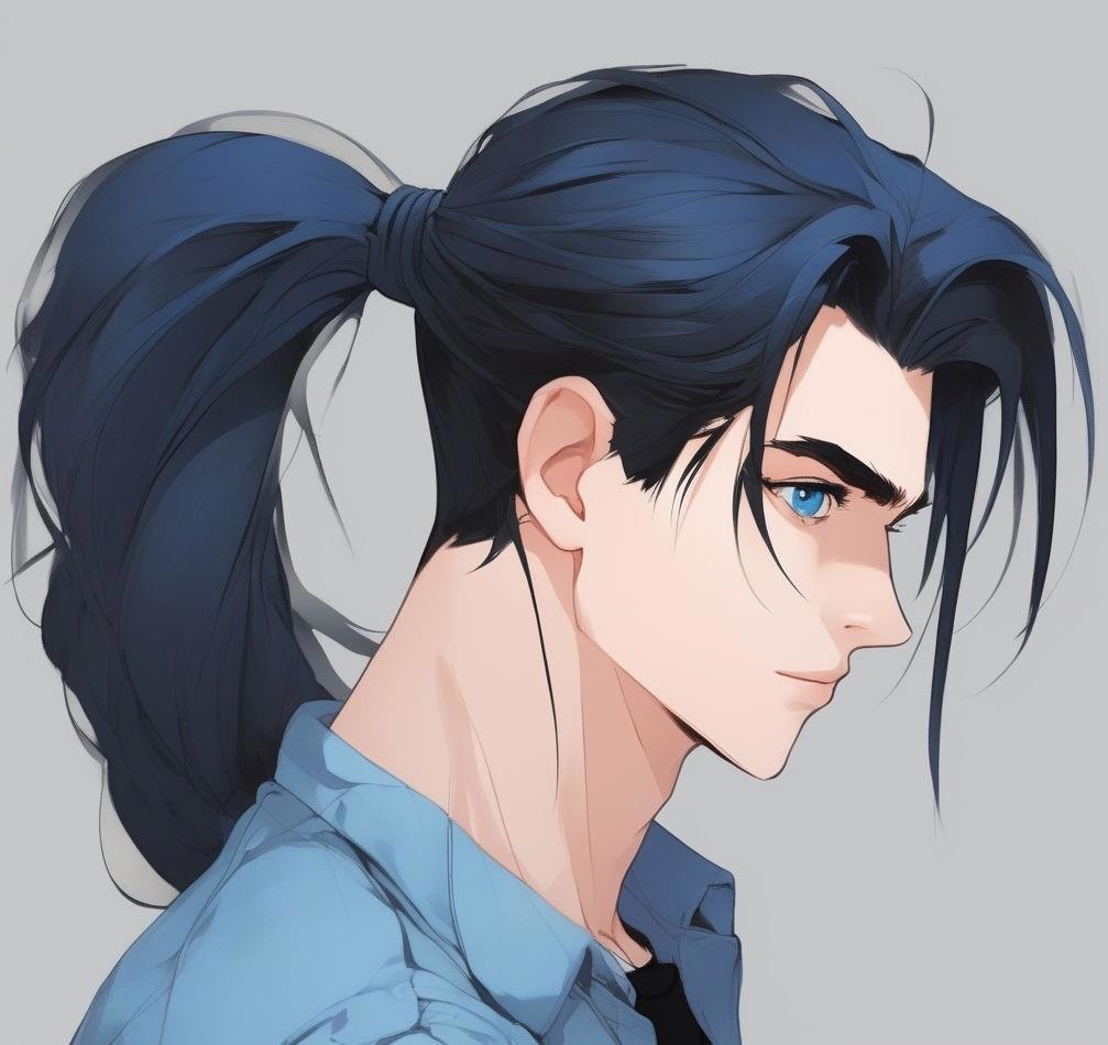 Восемнадцатилетний молодой человек с иссиня-черными волосами, забранными в длинный хвост и синими глазами