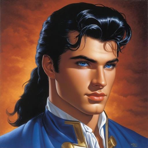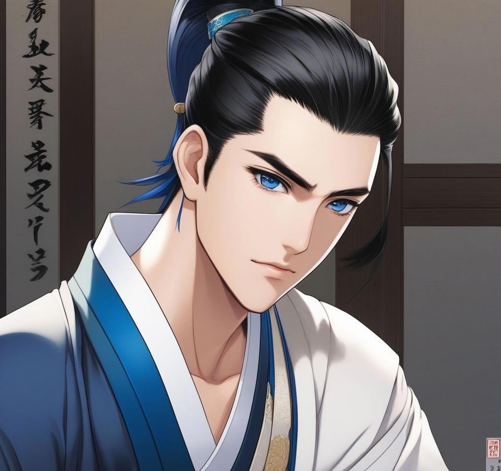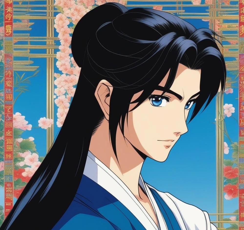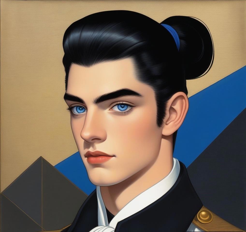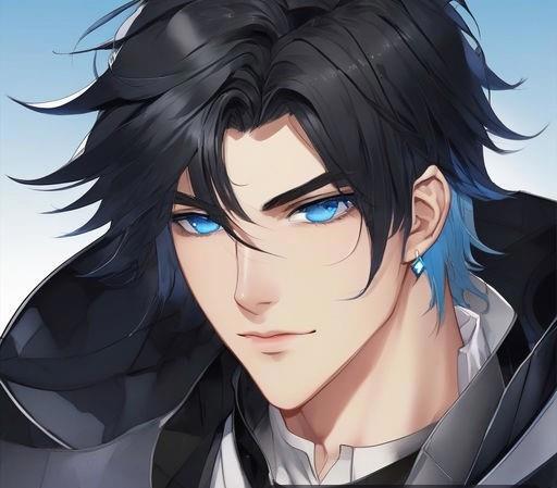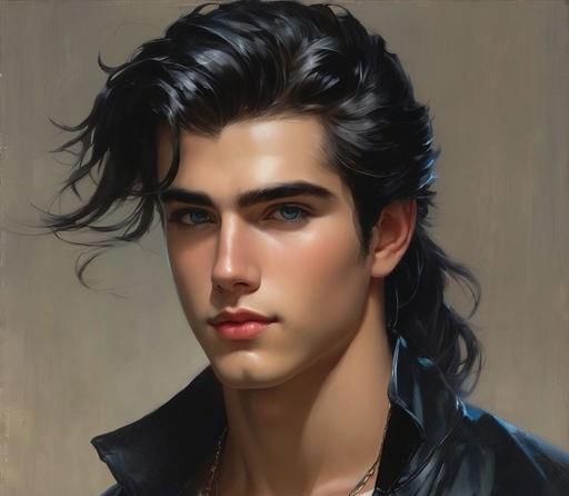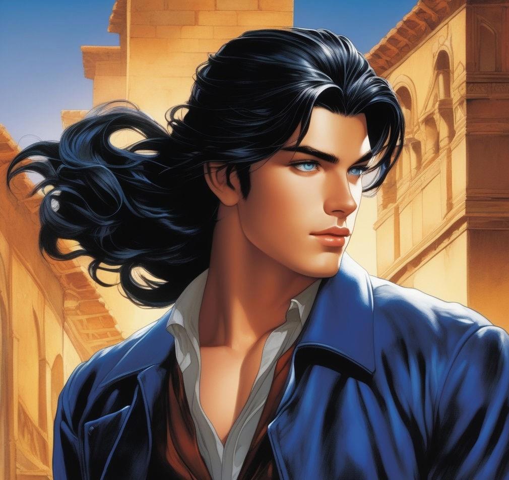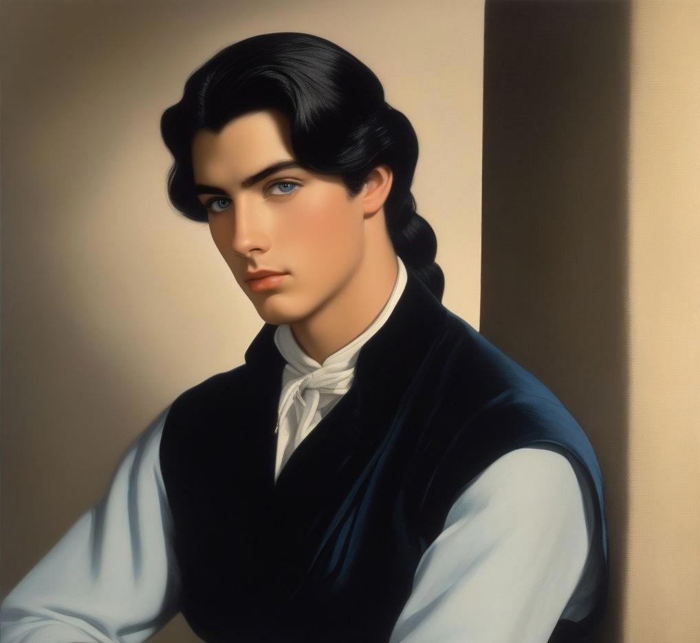 Восемнадцатилетний молодой человек с иссиня-черными волосами, забранными в длинный хвост и синими глазами