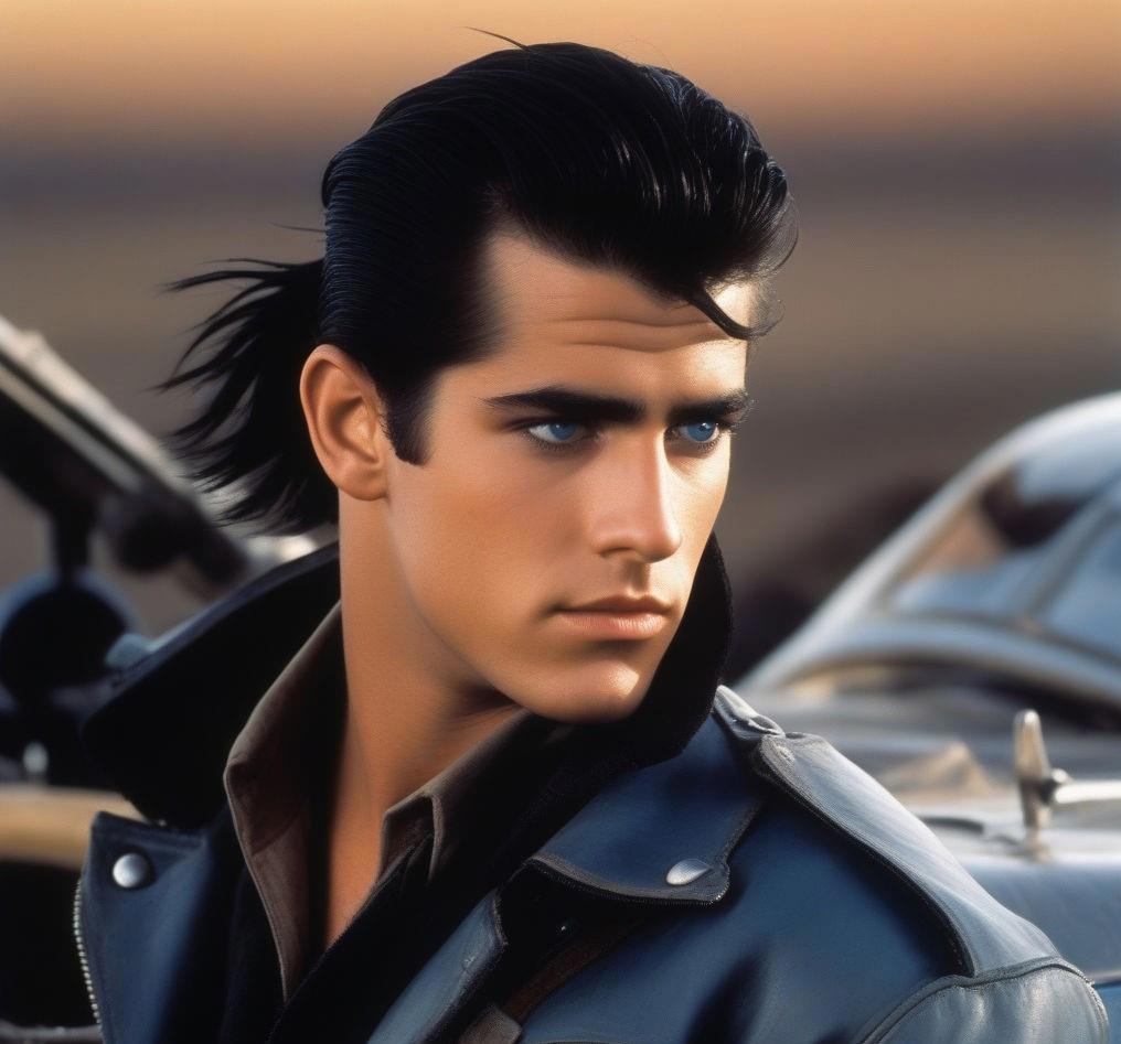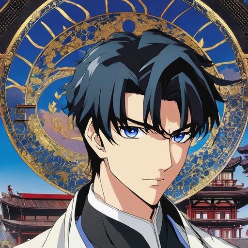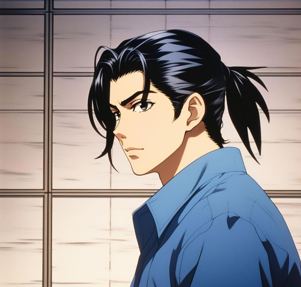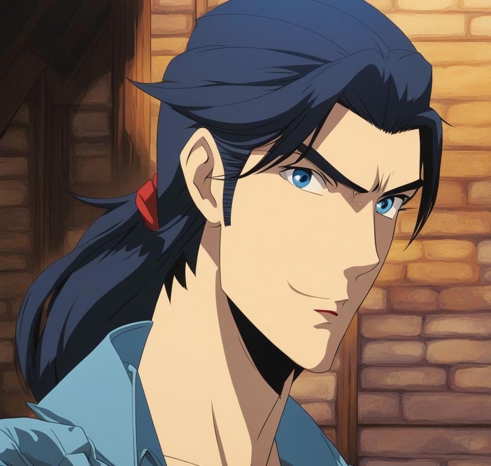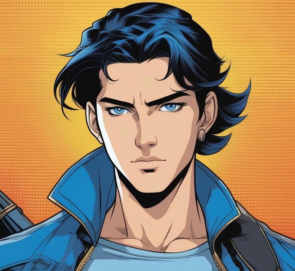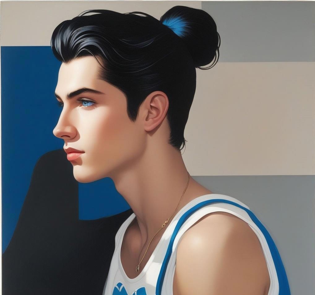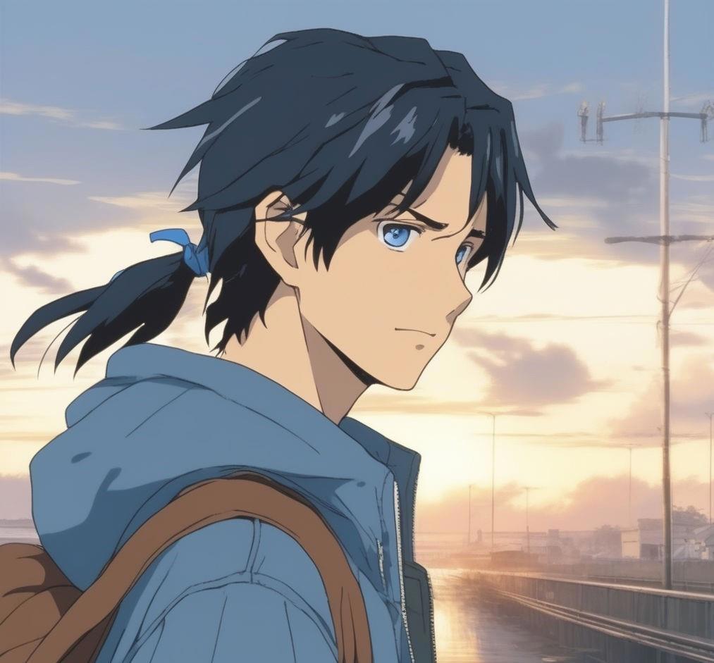 Восемнадцатилетний молодой человек с иссиня-черными волосами, забранными в длинный хвост и синими глазами