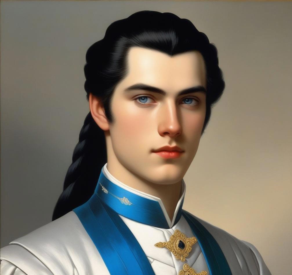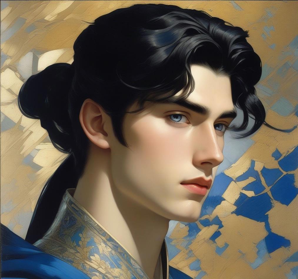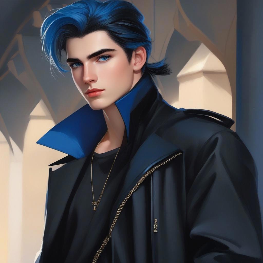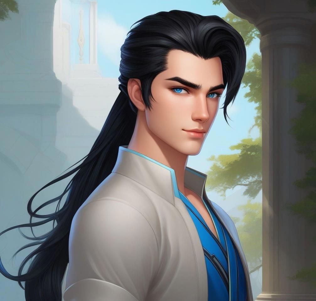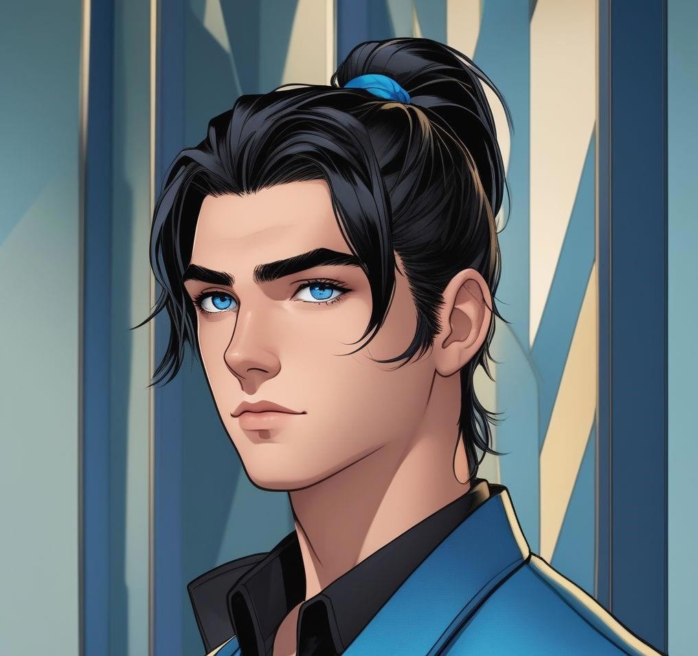 Восемнадцатилетний молодой человек с иссиня-черными волосами, забранными в длинный хвост и синими глазами