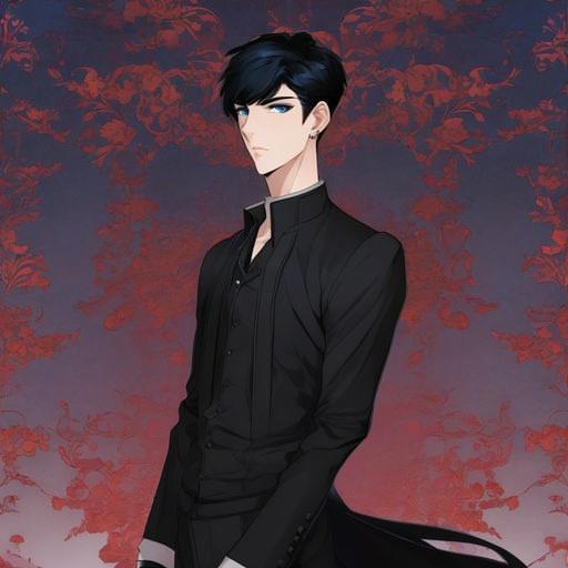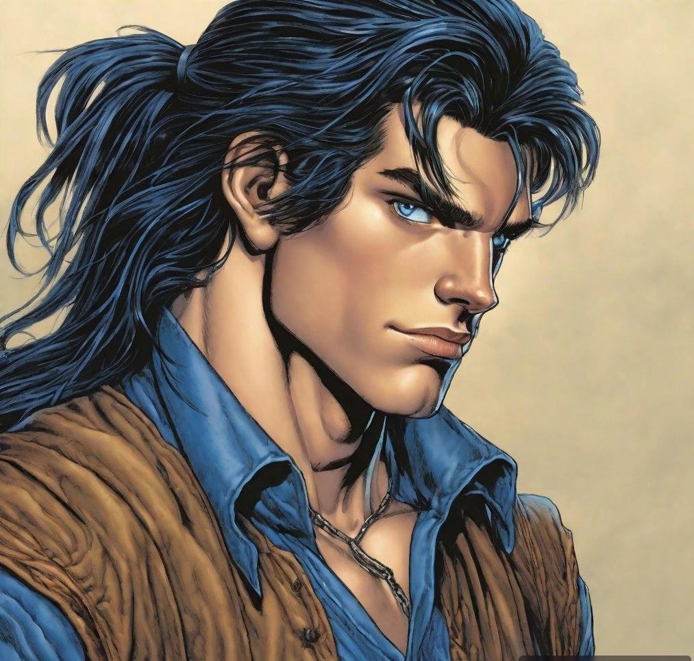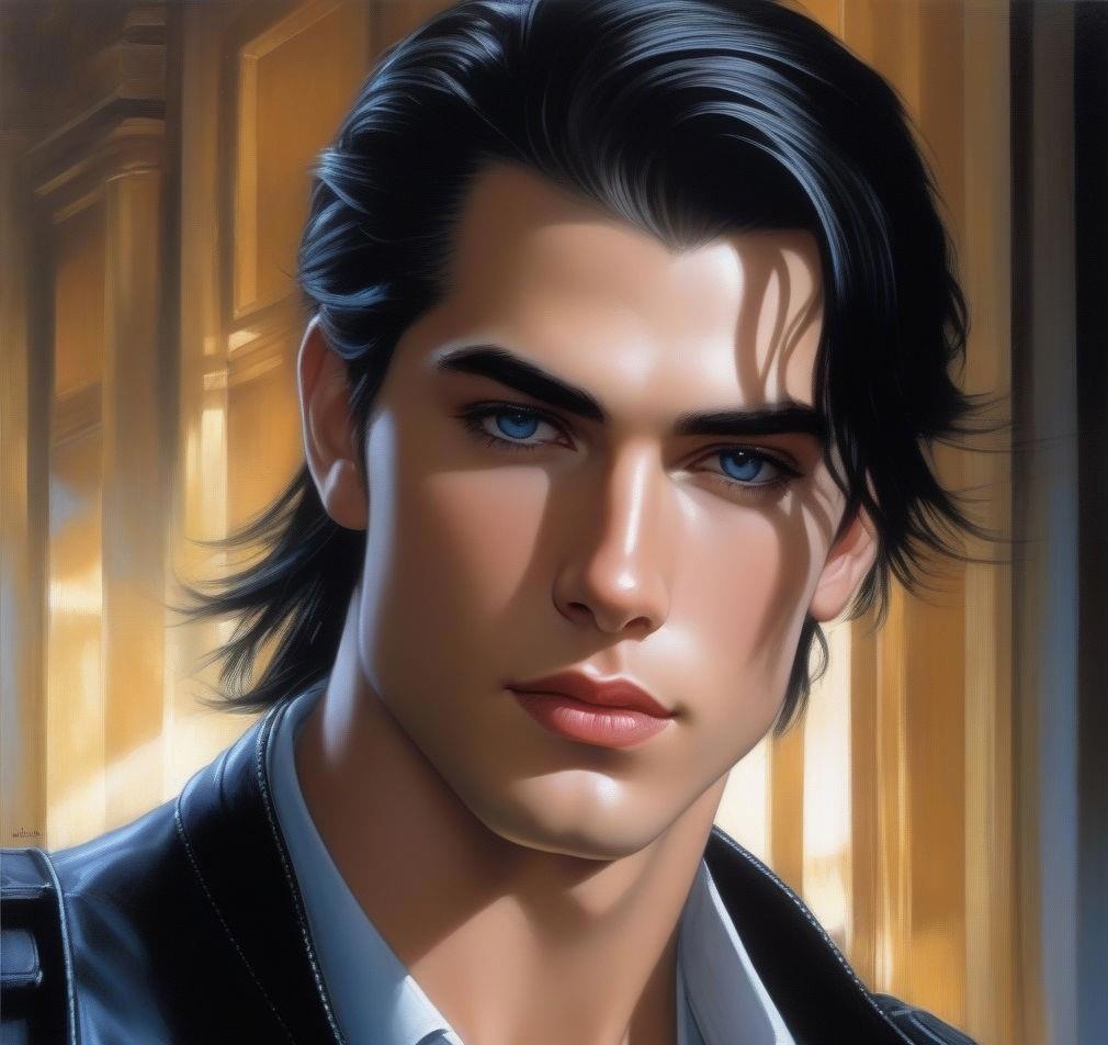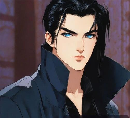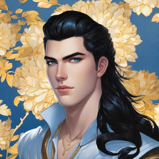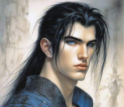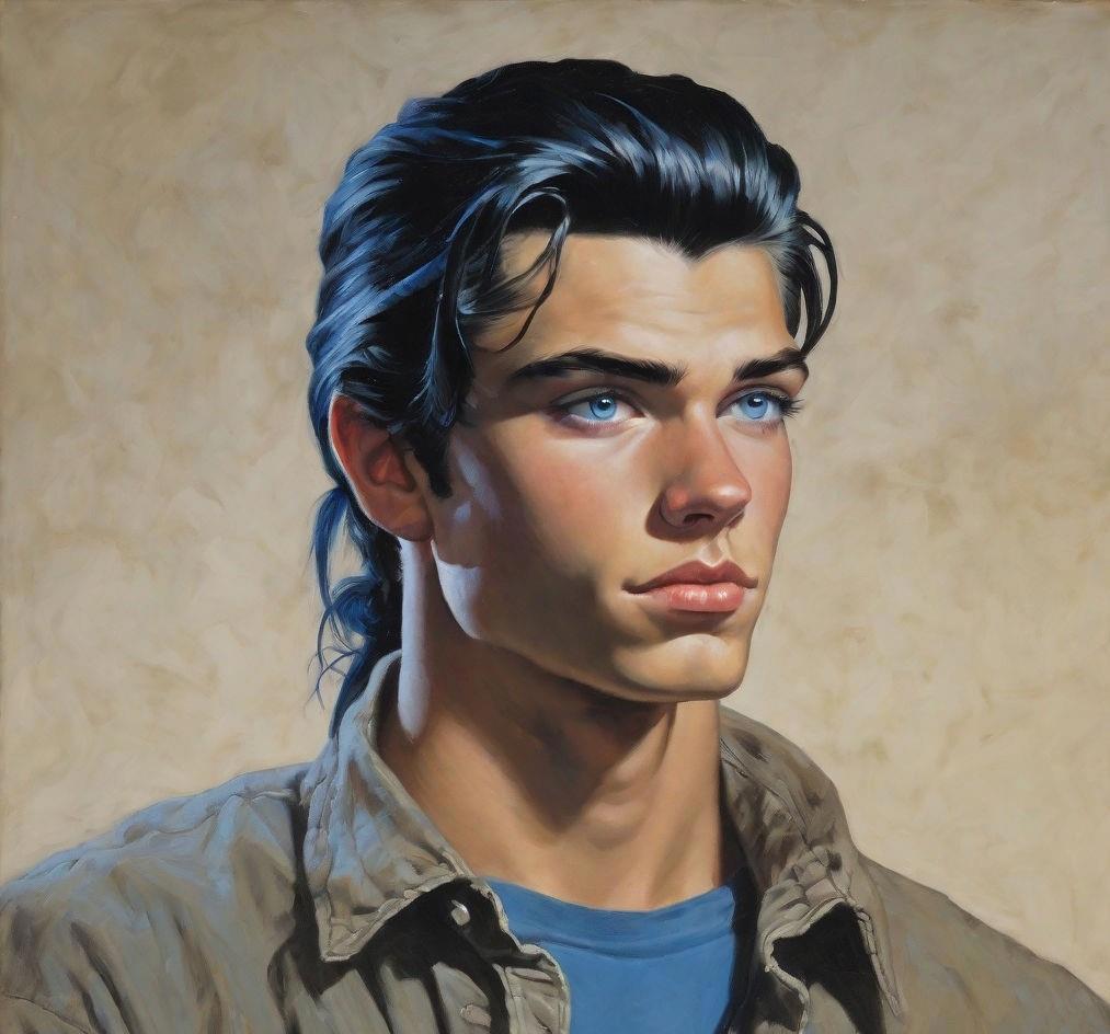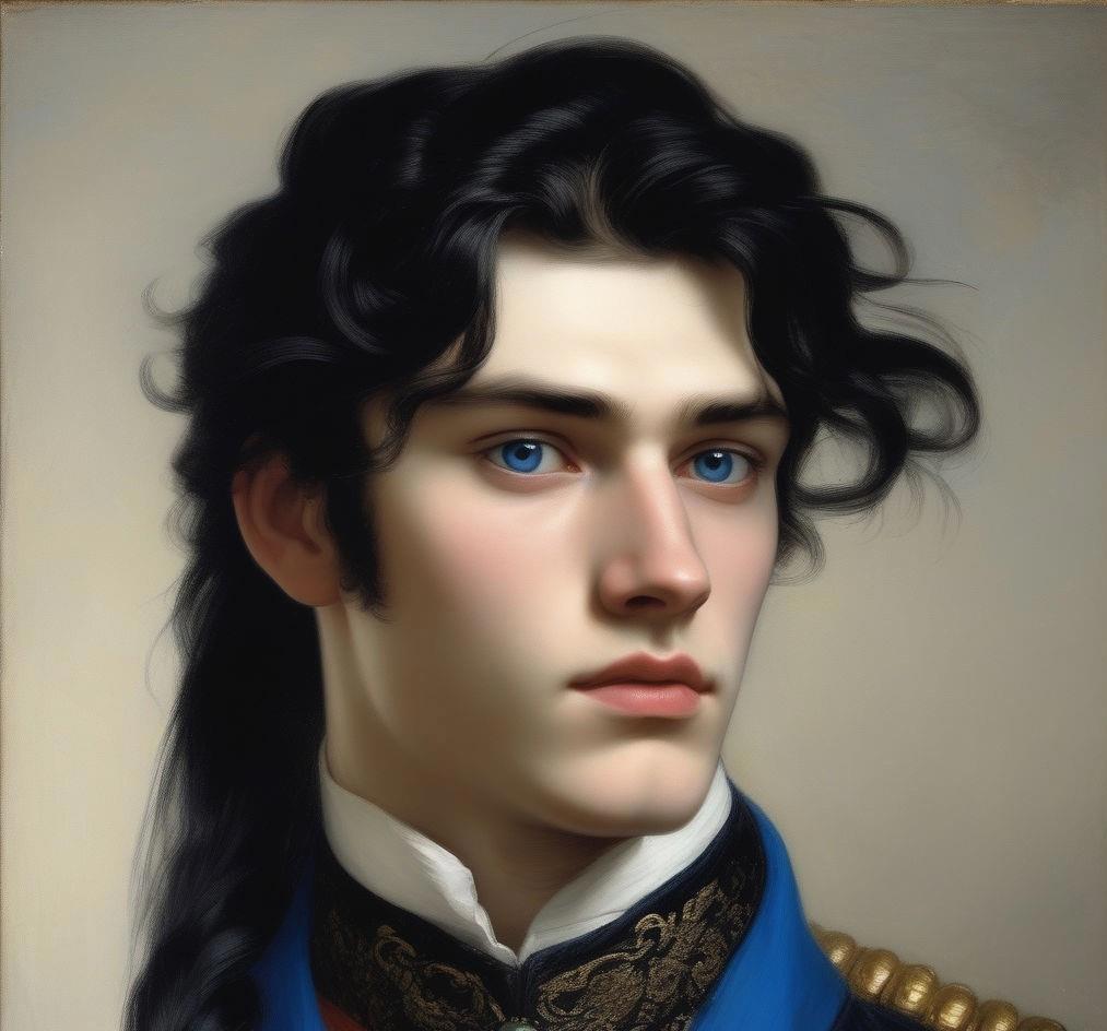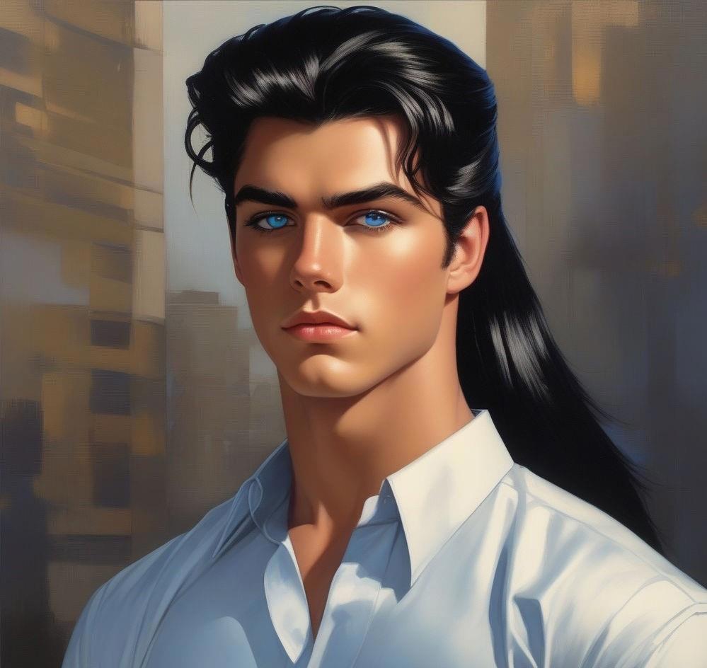 Восемнадцатилетний молодой человек с иссиня-черными волосами, забранными в длинный хвост и синими глазами