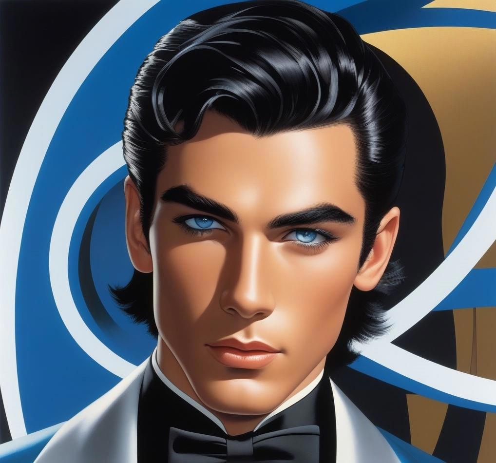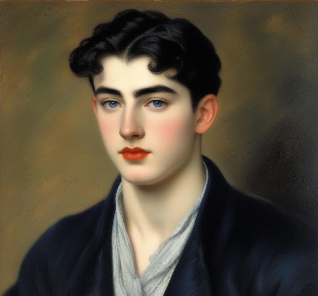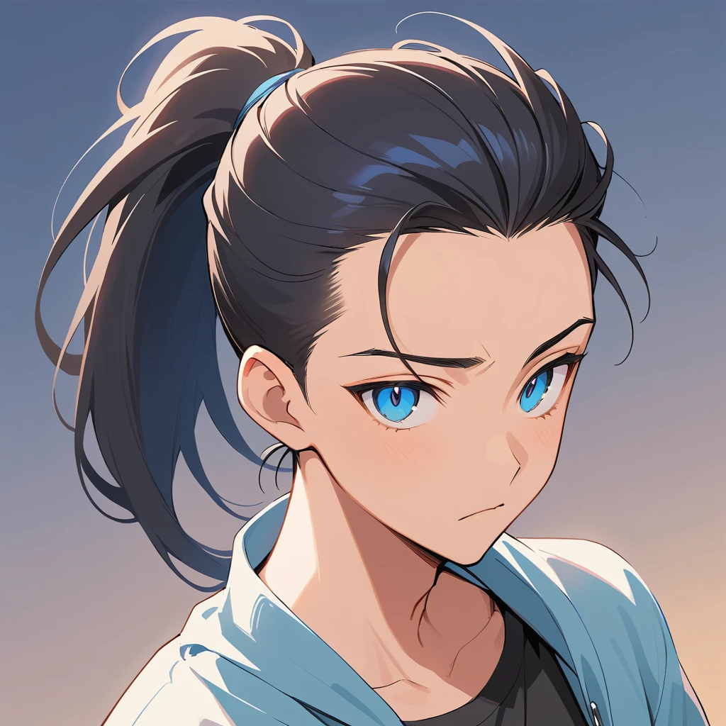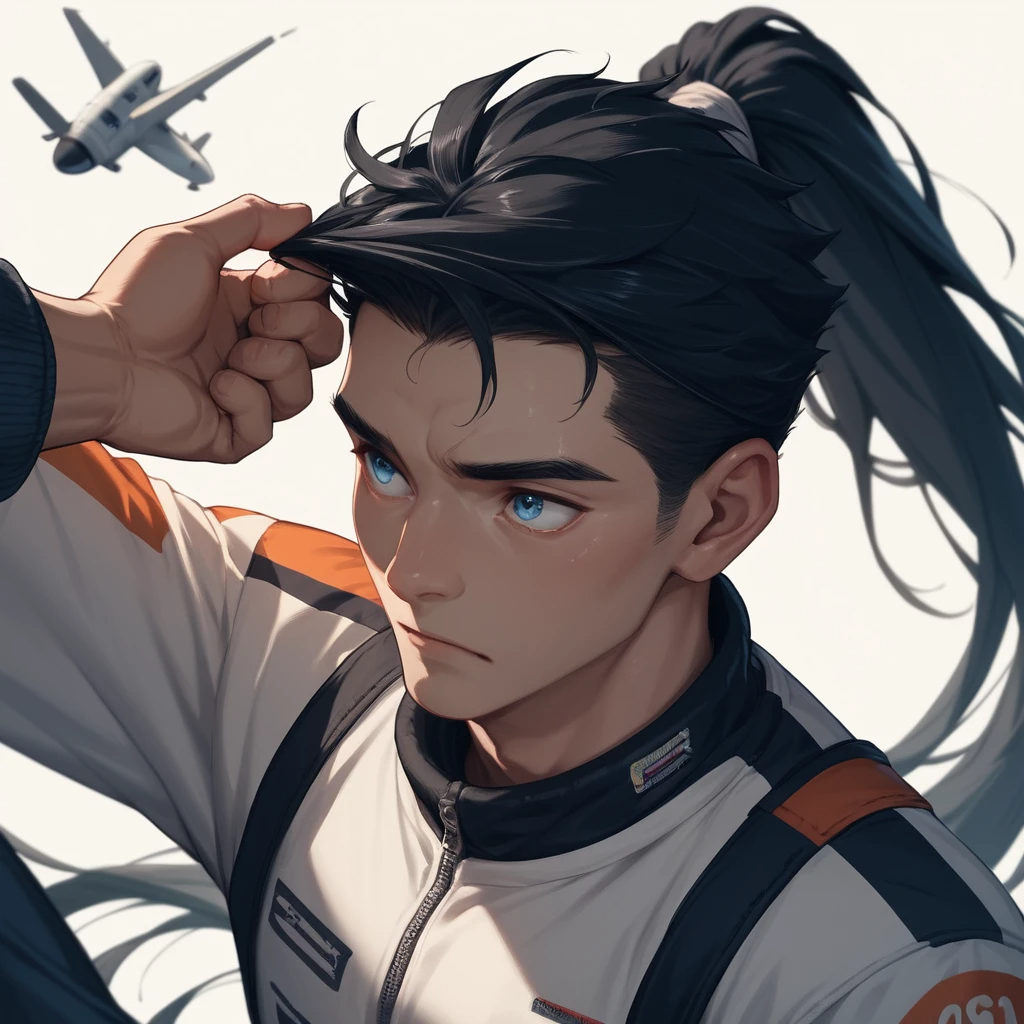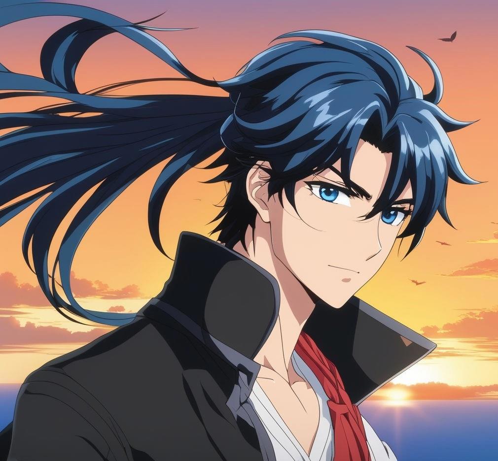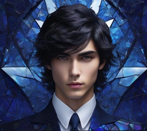 Восемнадцатилетний молодой человек с иссиня-черными волосами, забранными в длинный хвост и синими глазами