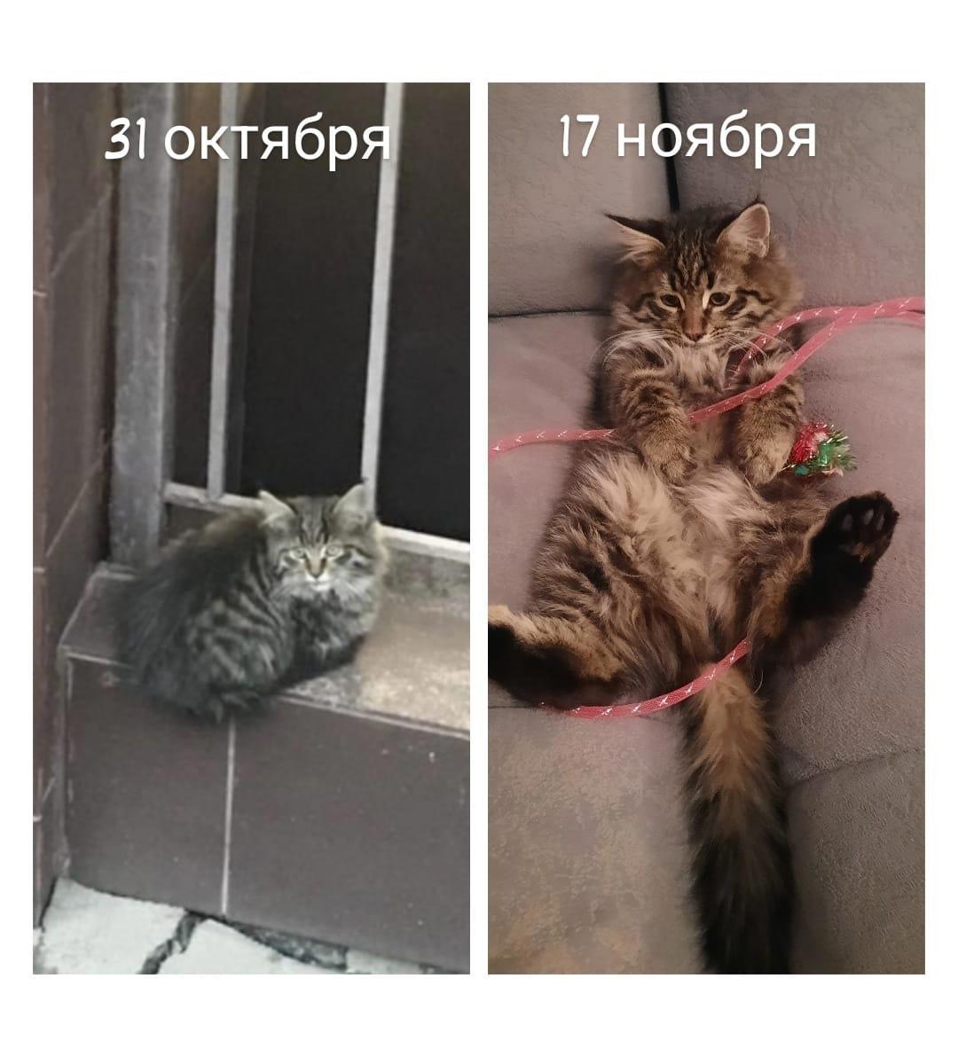Таким мы Барсика впервые увидели в домовом чате. Был жёсткий ветер и очень холодно. Барсик долго не давался в руки, царапался... - принесли его домой со 2 попытки... И таким он стал спустя 2,5 недели (справа).