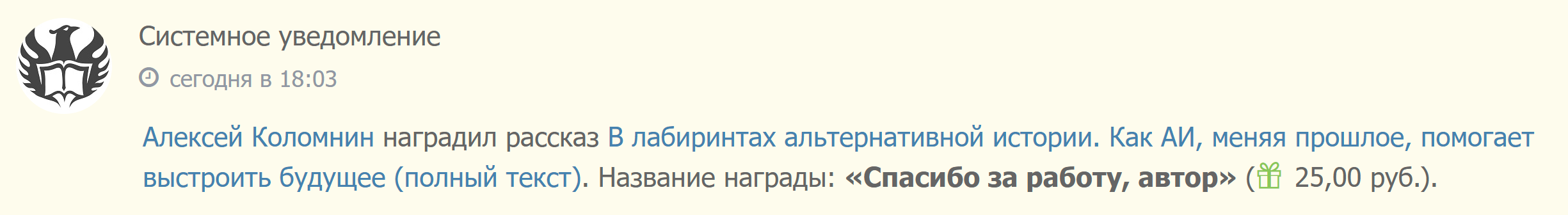 P.S. И буквально только что, около часа назад, как раз когда я составлял этот пост, за мою статью пришла символическая награда, вторая за все годы. Вселенная слышит нас…
