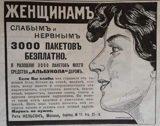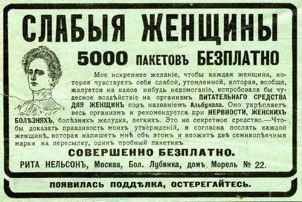 Бесплатно всем женщинам. Так как желаю, чтобы каждая женщина, здоровье которой неудовлетворительно, испытала действие «Альбукола», то по первому требованию высылаю пробный пакетик бесплатно по получении точного адреса и 2-х семикопеечных марок на пересылку.