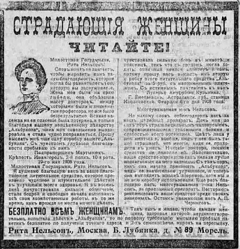 1. «Милостивая государыня, Рита Нельсон! Слов моих не хватает, чтобы выразить вам такую благодарность которая могла бы равняться с тою, которую вы заслуживаете. Жена моя была на краю гибели, она объездила массу докторов, между которыми были и знаменитые профессора, но всё было безрезультатно. Всякая надежда на её спасение была потеряна, и только благодаря вашему неоценённому лекарству „Альбукола“, жена моя совершенно выздоровела и стала чудно поправляться. Прошу выслать мне ещё одну коробку вашего „Альбукола“. С чувством глубокой благодарности пребываю к вам. Подпрапорщик Мартынюк. Крепость Ивангород, 2-й полк, 10-я рота. 19 мая 1908 года.»