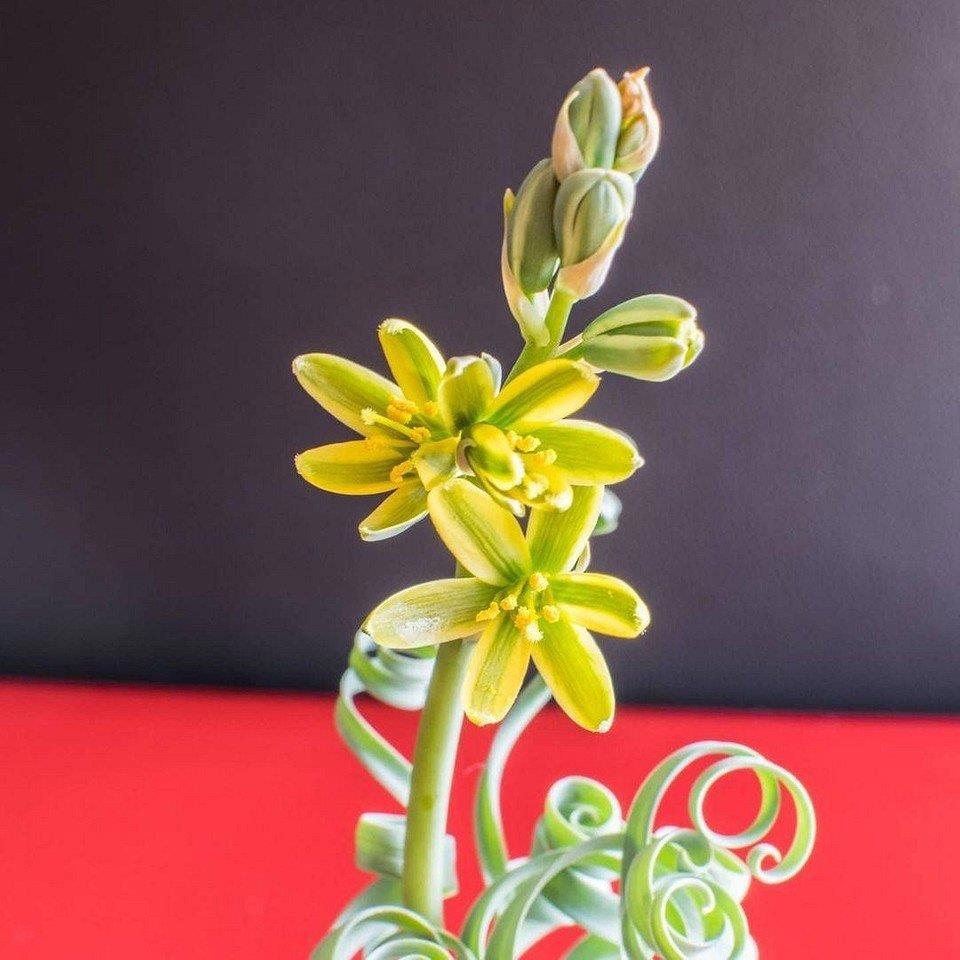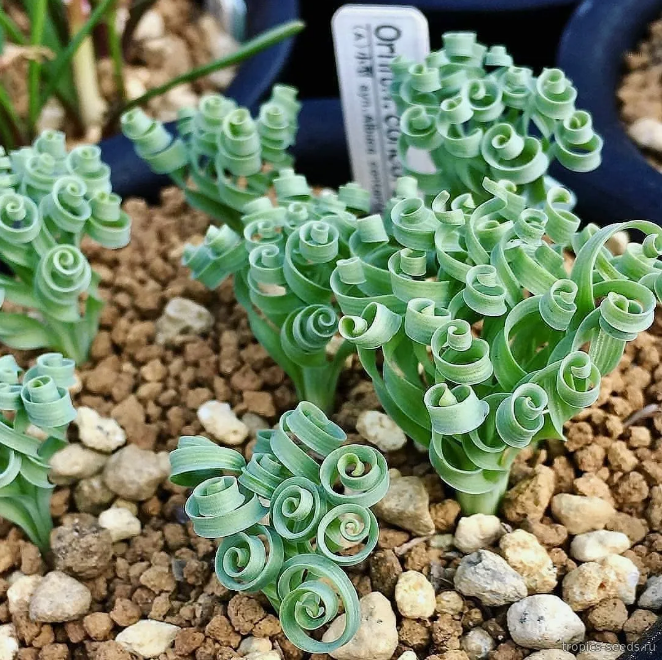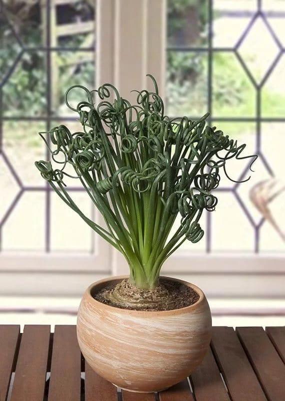 Альбука спиральная, что на картинке — многолетнее луковичное растение высотой 15-20 см. Молодые листочки вначале растут вертикально, и лишь потом, при благоприятных условиях, кончики их начинают «завиваться» — это способствует меньшему испарению влаги. Общая длина листьев, если их раскрутить, может достигать 30 см.