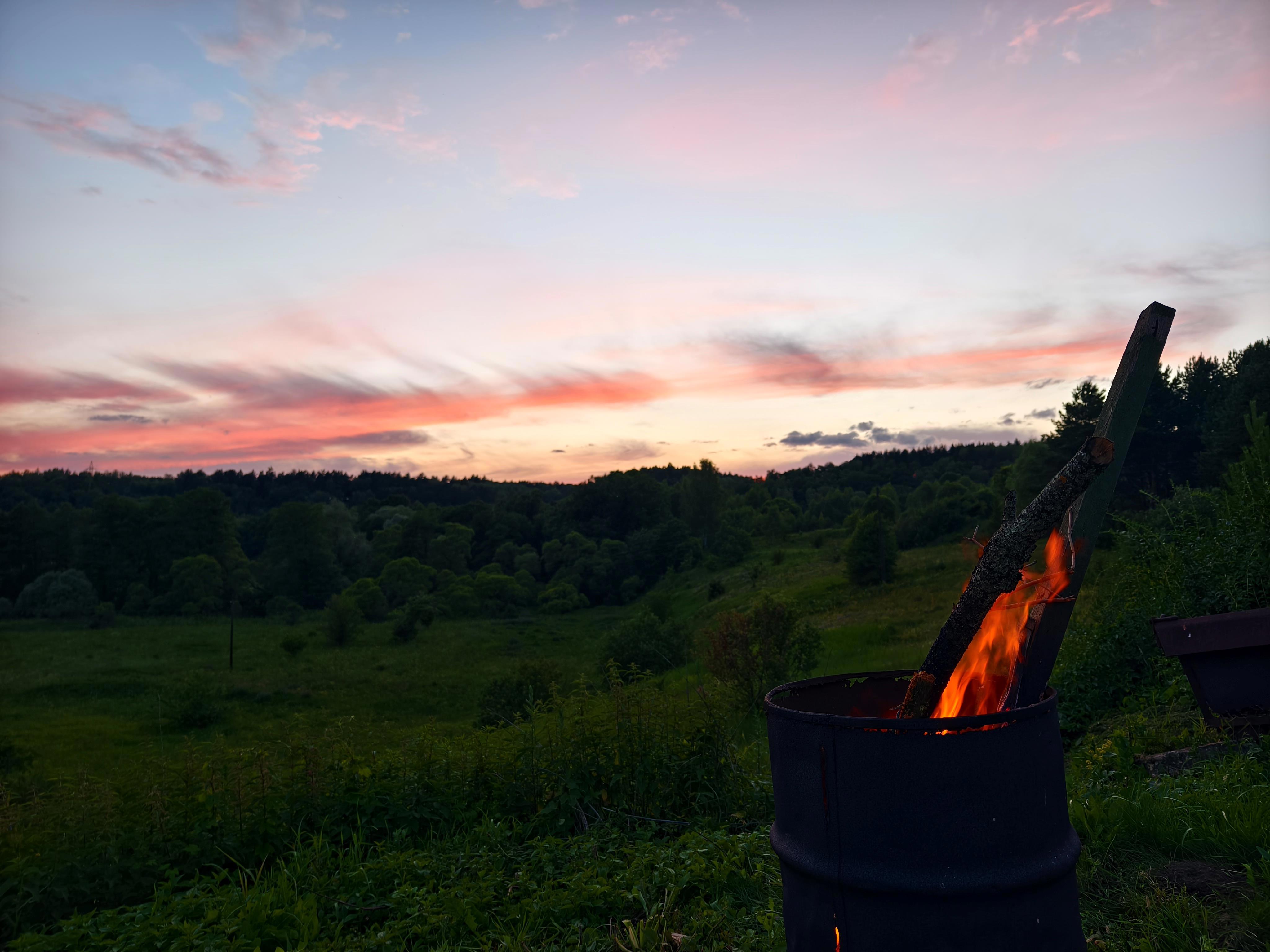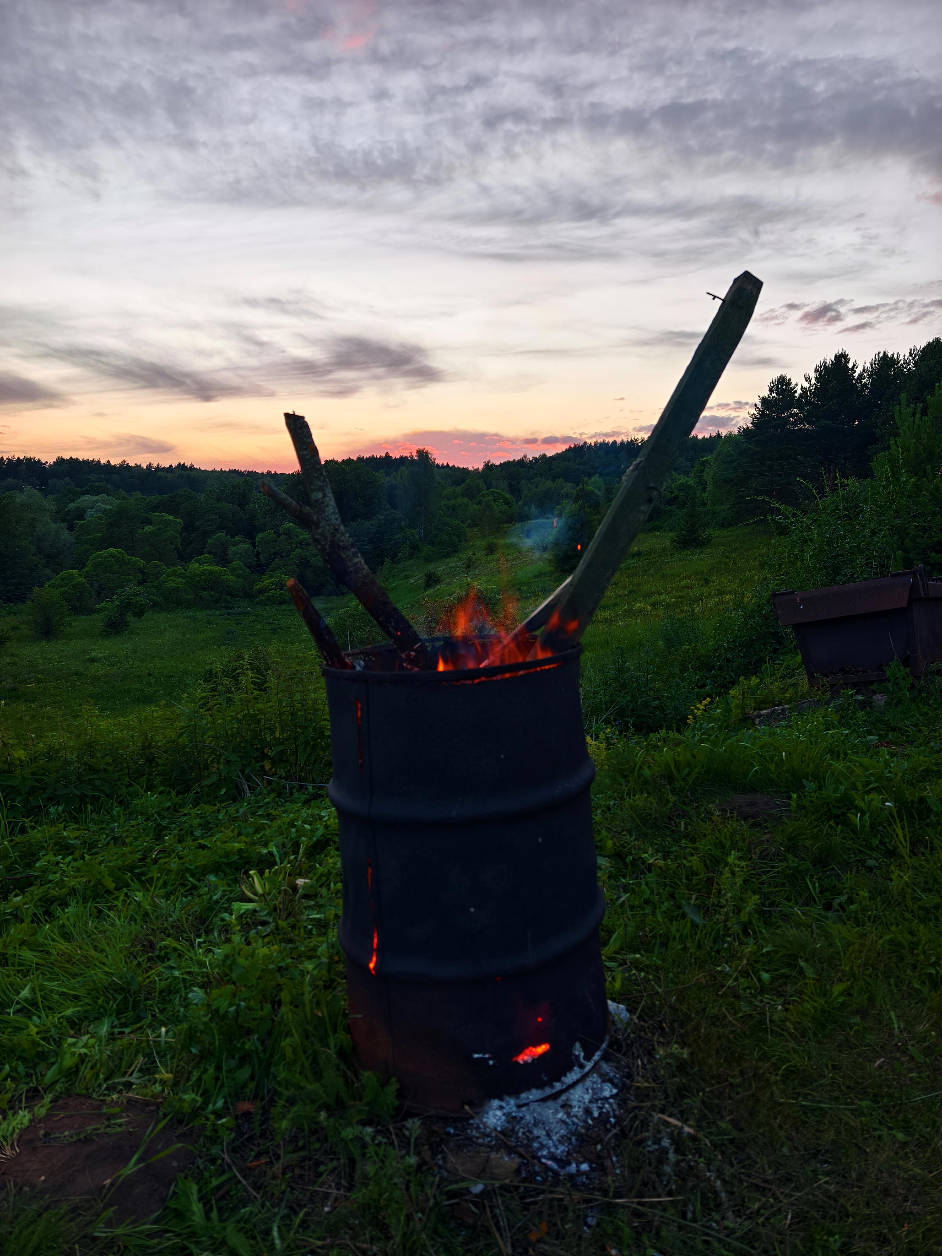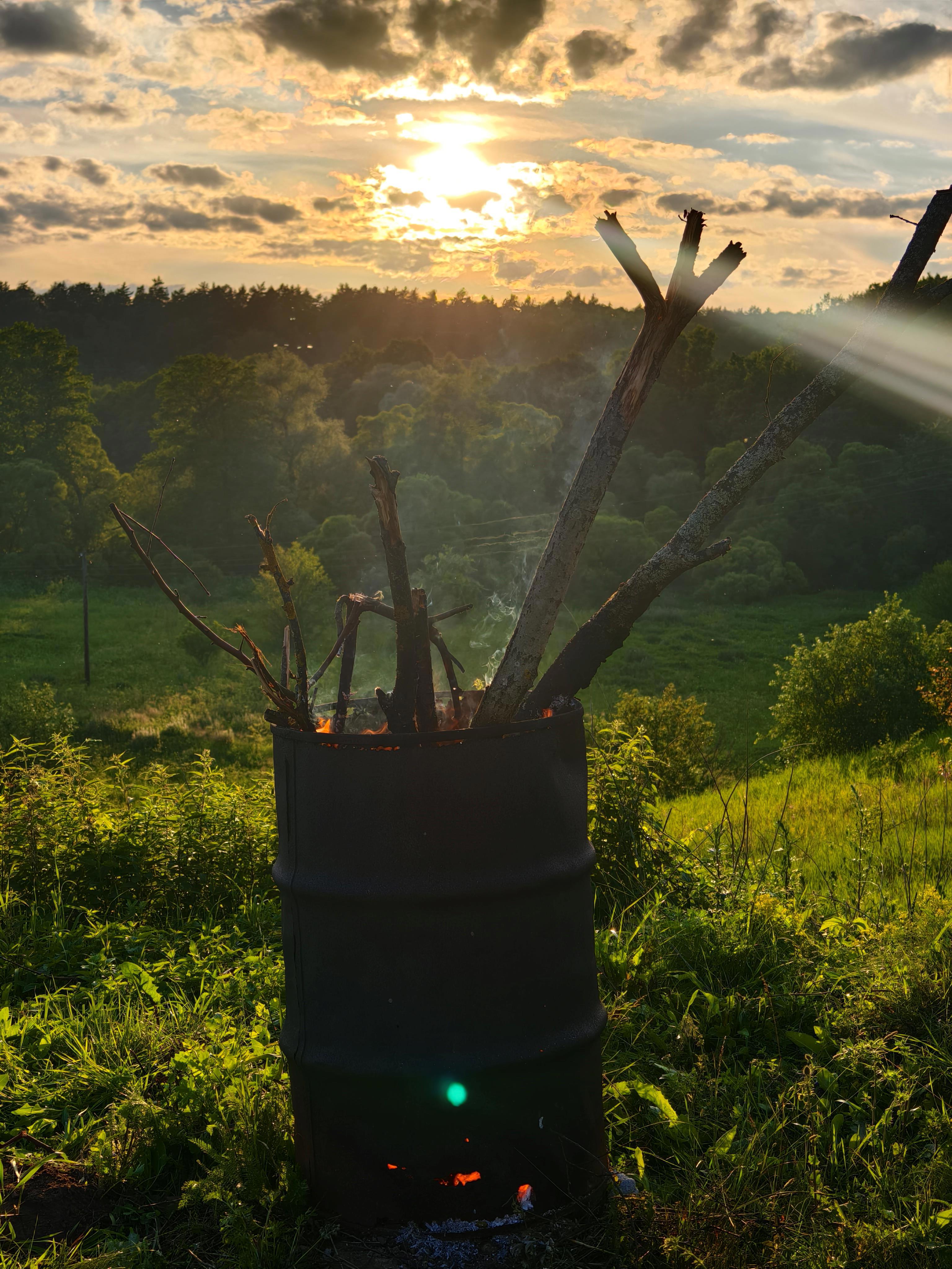 И вот я жгу разные ветки на даче и думаю... Да ни о чём не думаю. Просто смотрю на игру света, тени, дыма, солнца, огня. А тут ещё закат красивый передают.