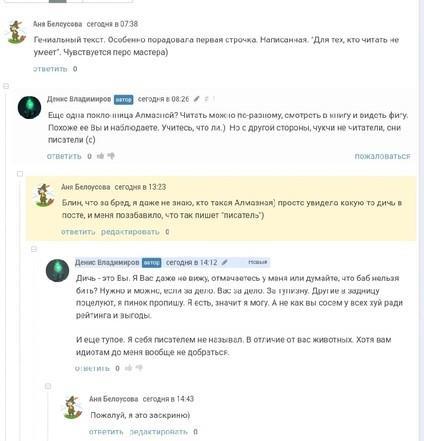 Меня так позабавил этот «деконструктивный примитивизм», что, каюсь, не удержалась и слегка откомментировала происходящее. Сразу оговорюсь, что не отношусь к тем людям, которым посвящён сей нетленный пост (по крайней мере, не относилась до сегодняшнего утра). Просто меня очень позабавило, что человек, который что-то там написал и называет себя «писателем», так злобно и неадекватно общается со своими мозгошмыгами хейтерами. А дальше начало-о-ось…