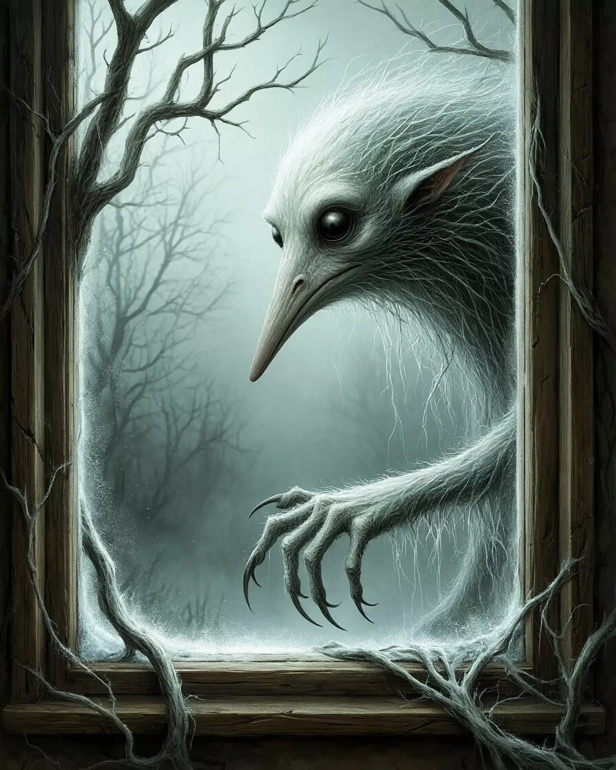 После, жадно уставясь на спящую провалившимися глазами, оно прильнуло к окну с такой силой, что затрещала деревянная рама. Стёкла задрожали, готовые рассыпаться. Плоская морда чудища исказилась гримасой, в которой смешались голод и странное, почти человеческое любопытство.
