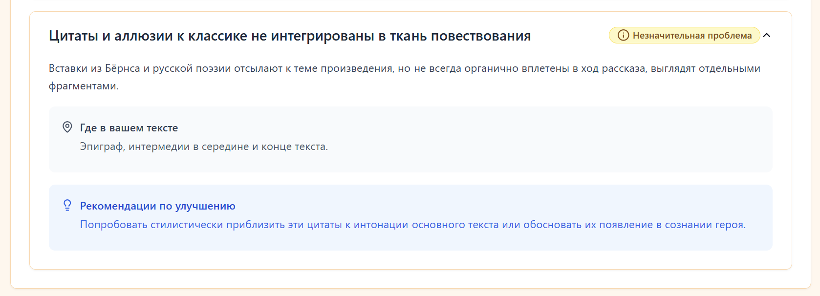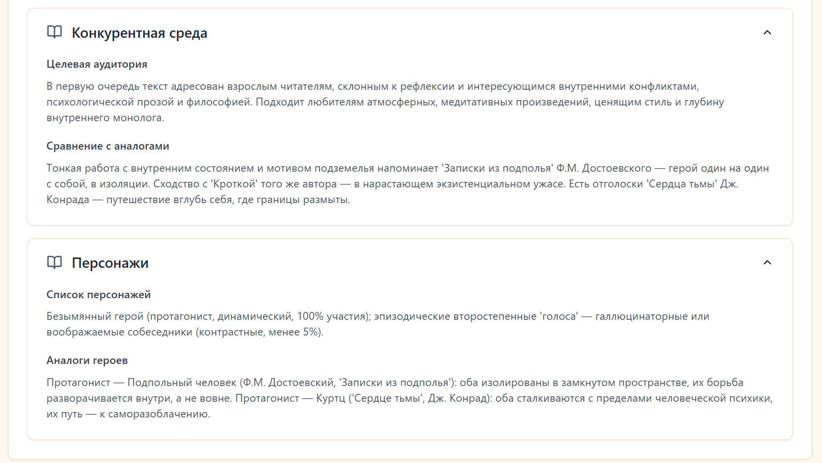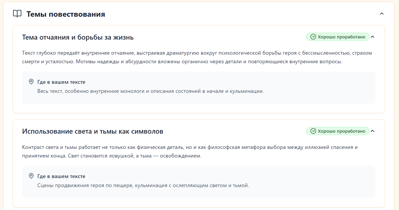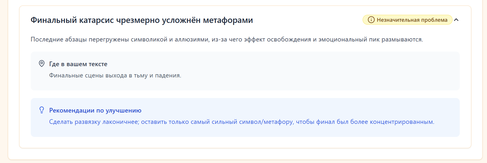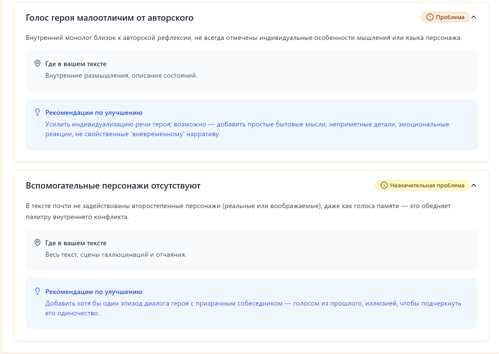 Раньше ради интереса просто кидал свои рассказы в ИИ-чаты - из разряда ,"прочитай, оцени". Ответы были разрозненные, часто общие, без структуры. Но недавно попробовал сервис, который формирует полноценный разбор: сюжет, язык, темп, повторы, сильные и слабые стороны, а самое главное - индивидуально для загружаемого текста.
