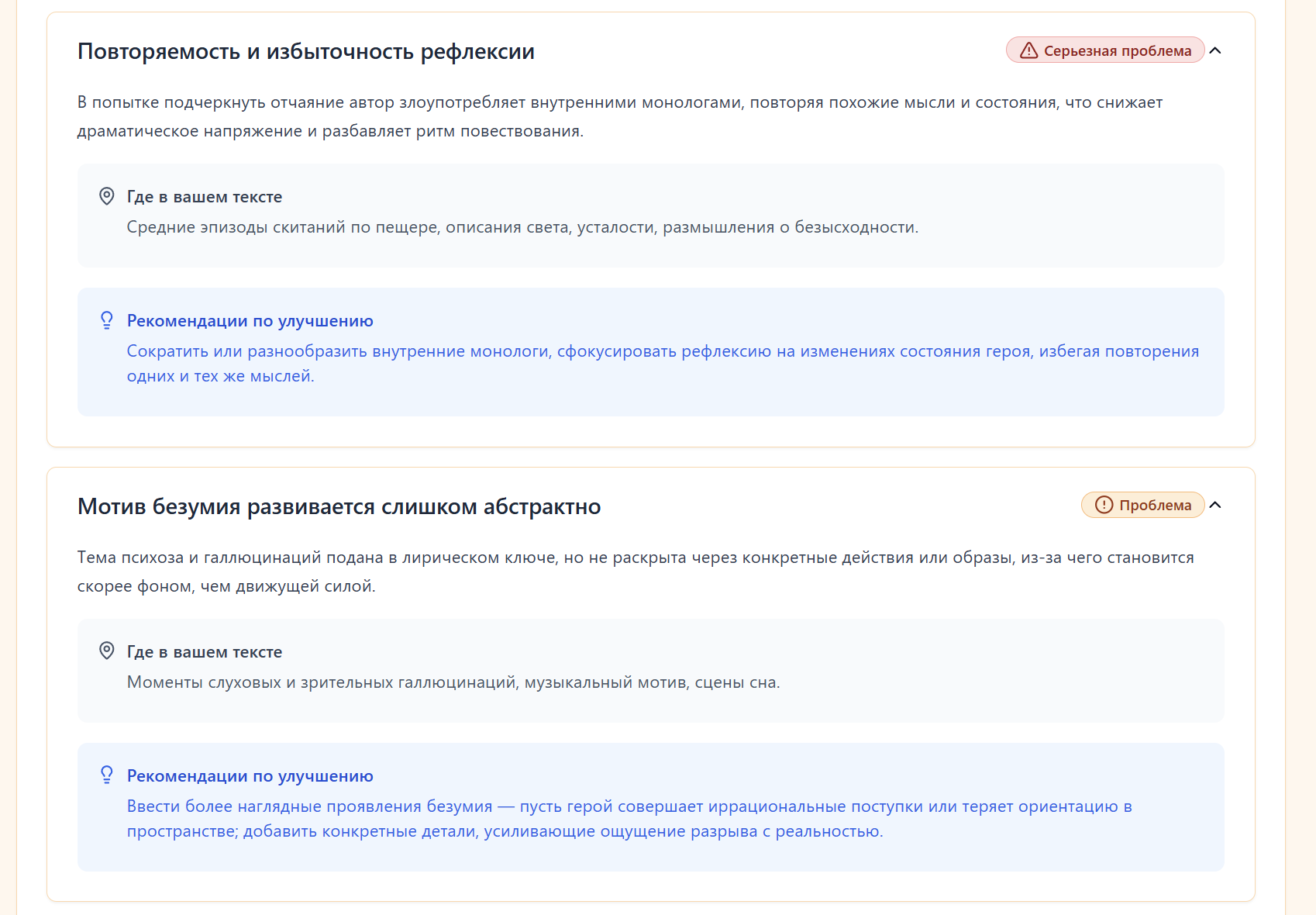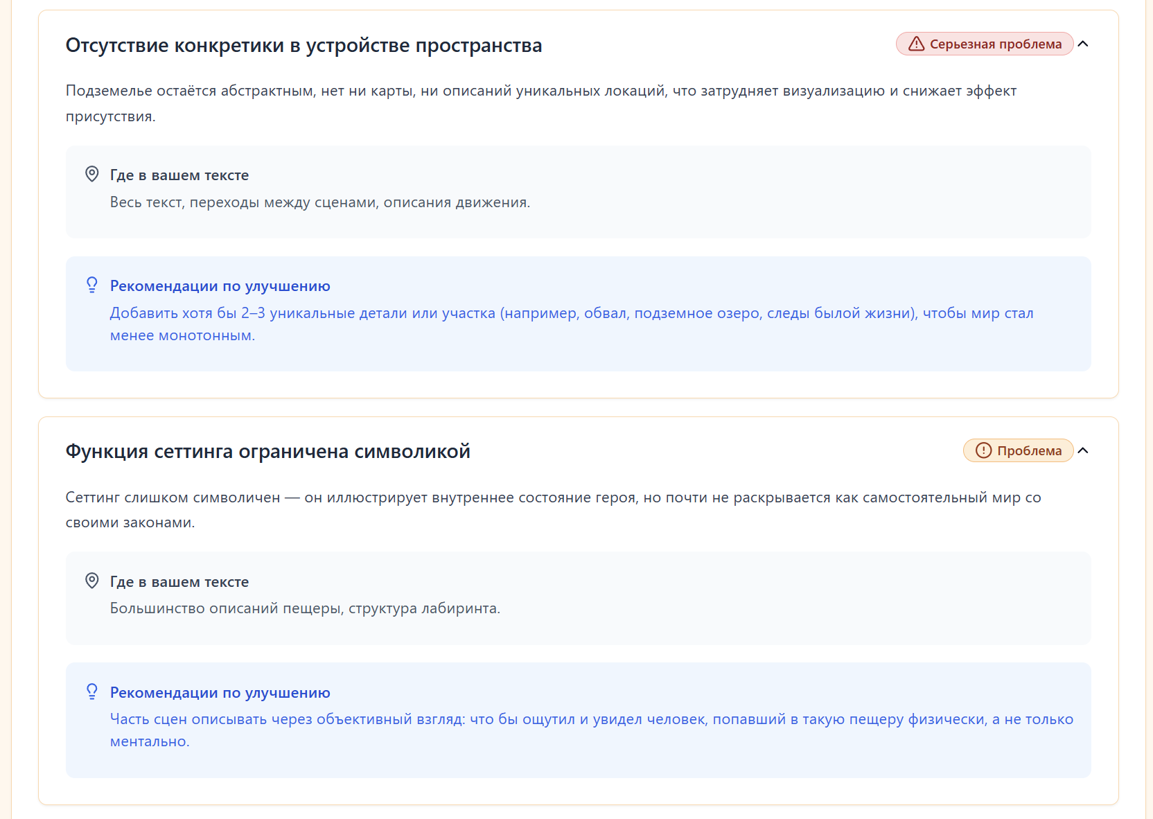 И вот тут уже появляется ощущение, что это не просто болтовня, а осмысленный анализ. Без оценок вроде "10 из 10", но с чёткими замечаниями, рекомендациями и указанием мест в тексте. Где-то соглашался, где-то нет, но главное - это действительно дало пищу для размышлений.