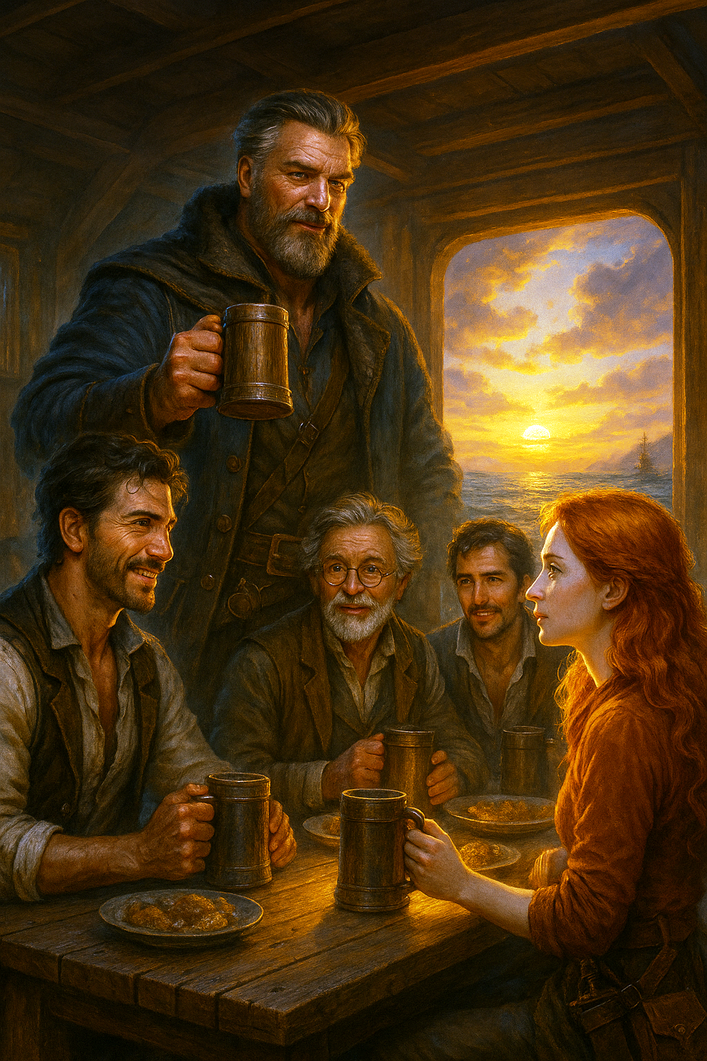 Когда солнце стало медленно опускаться за горизонт, раскрашивая небо в золотисто-оранжевые и розовые оттенки, капитан Стормвуд пригласил их присоединиться к команде на ужин в камбузе.