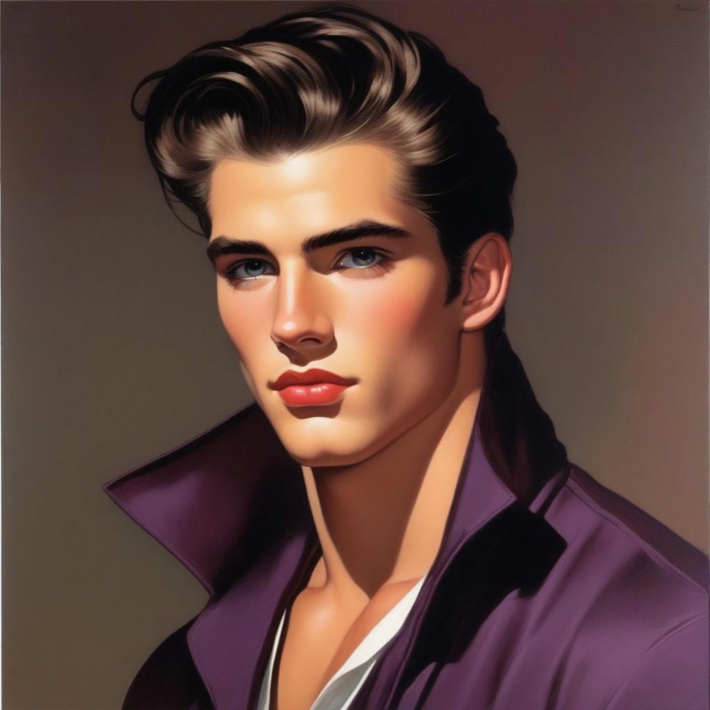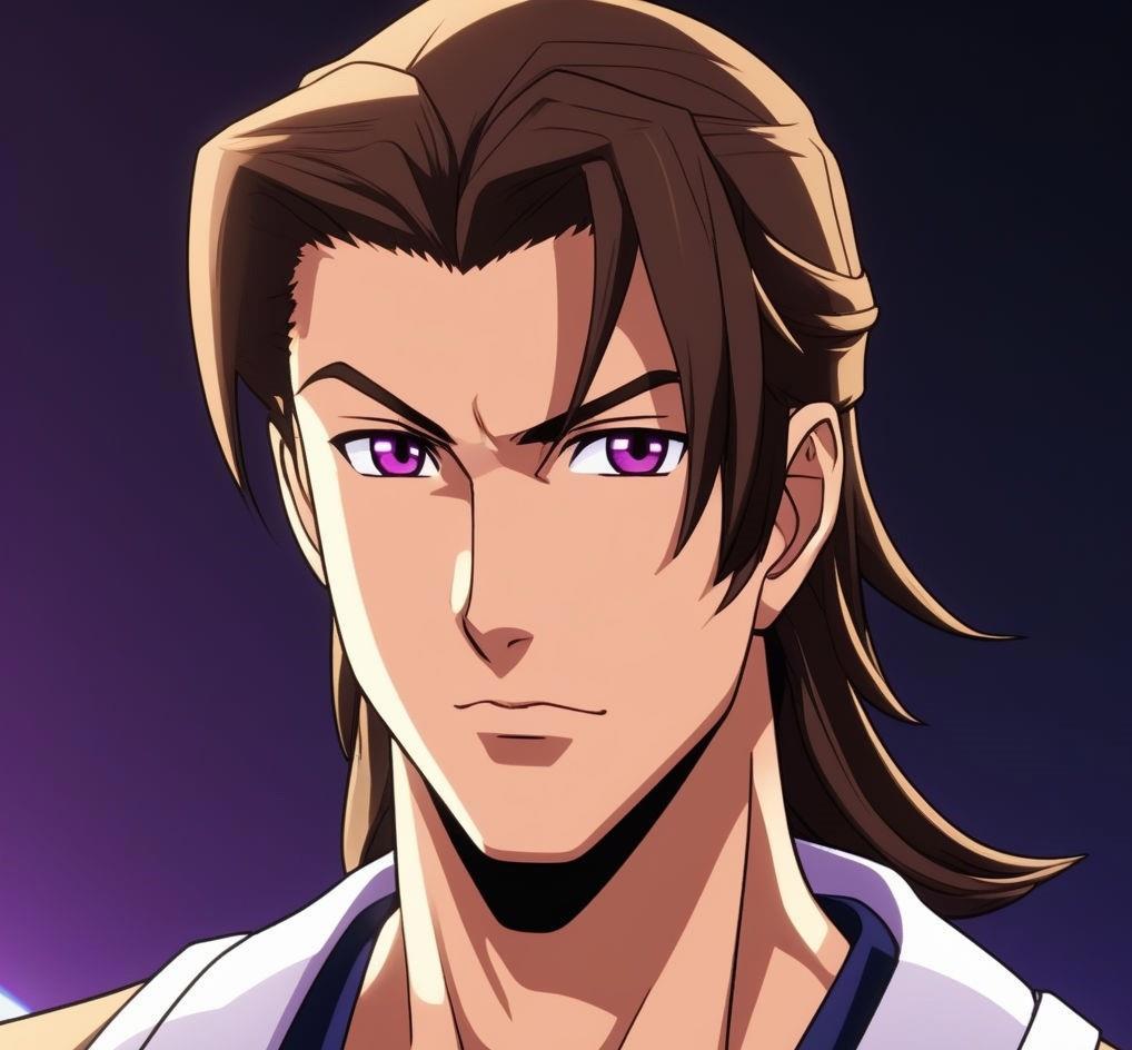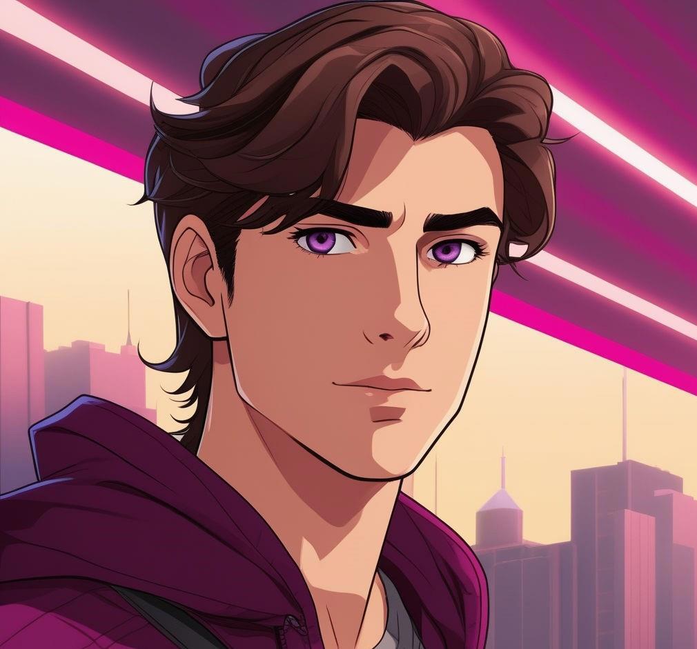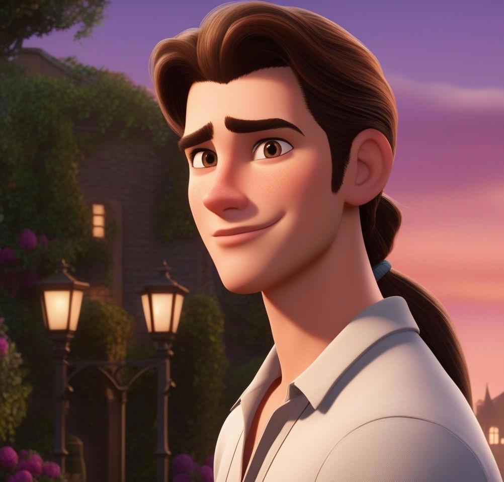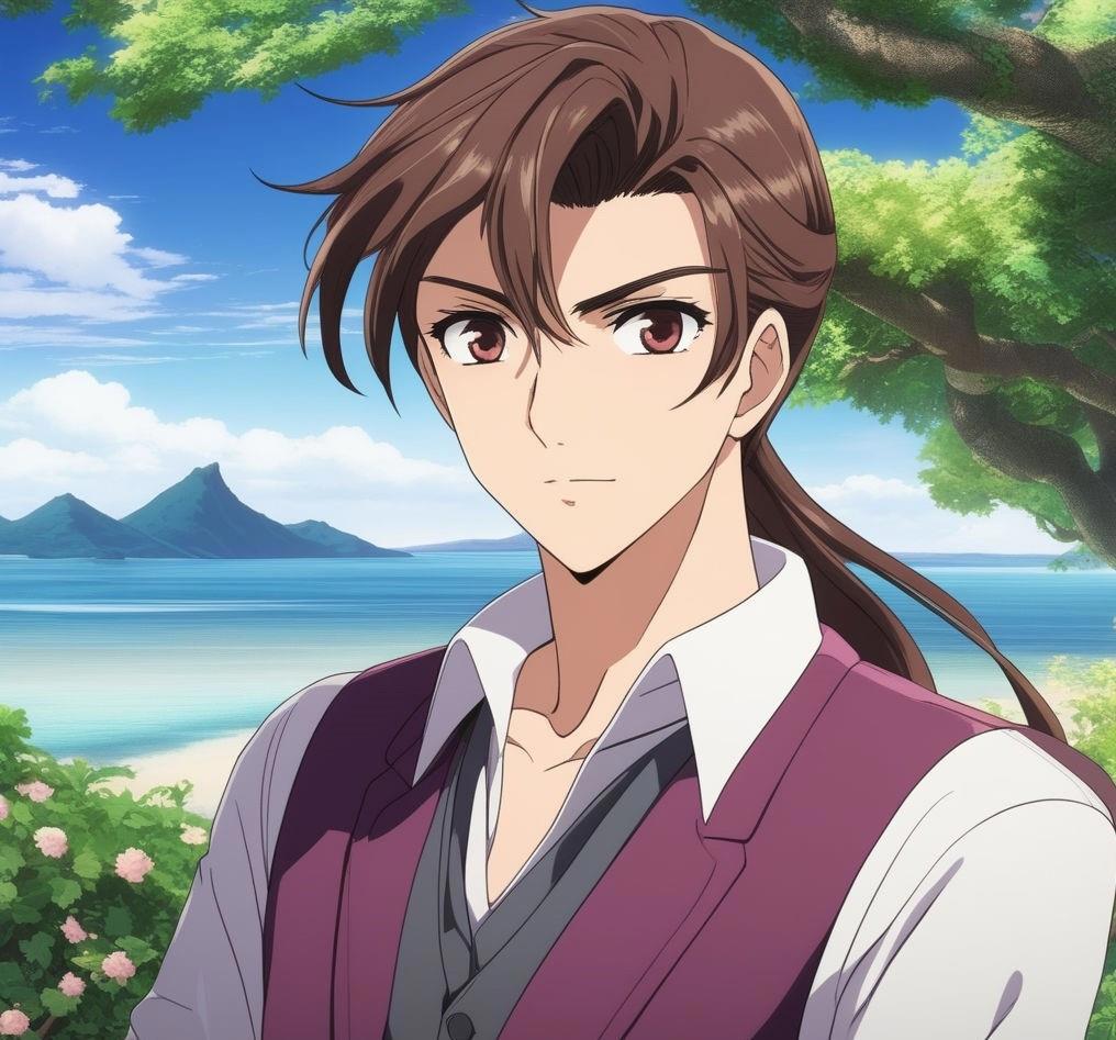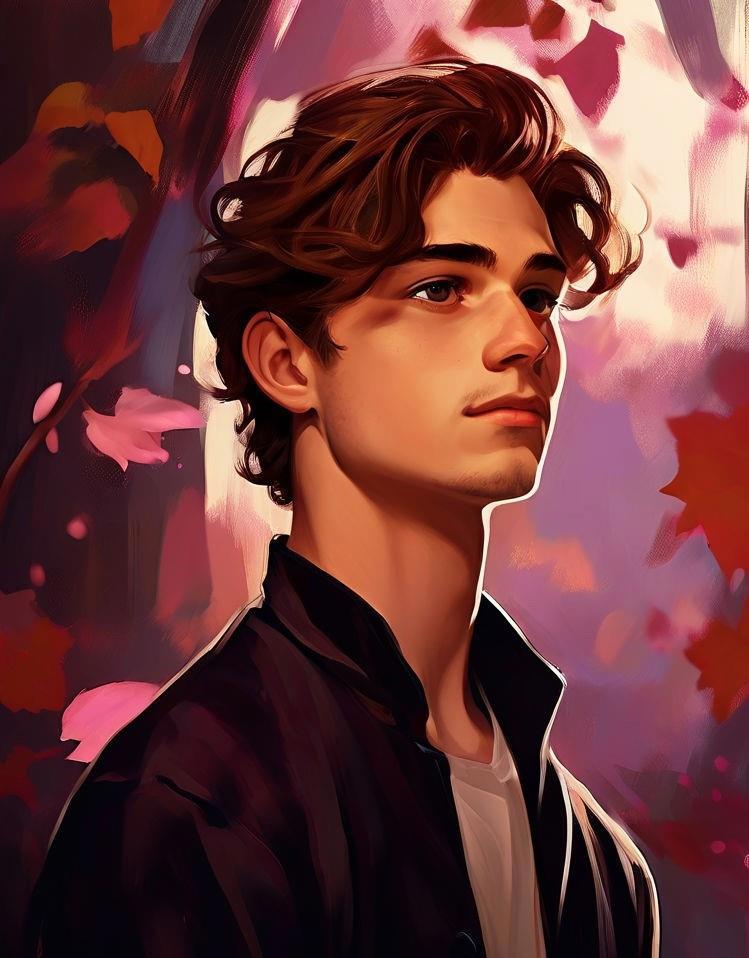 Высокий восемнадцатилетний молодой парень с каштановыми волосами, забранными в длинный хвост и глазами цвета сливы
