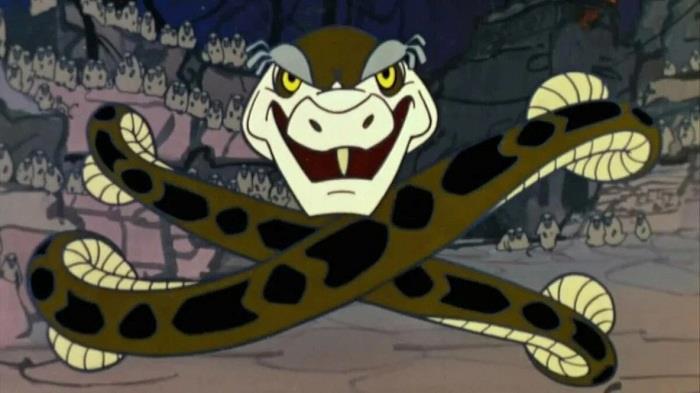 Это, кстати, заметно - анималист Репкин всегда очень строго подходил к изображению животных. Несмотря на сказочные сюжеты, как правило, анатомически все исполнено безупречно. И Репкин бы, конечно, никогда не нарисовал змее брови. Да еще какие! Фактически "брежневские". Но зато для мимики Каа эта деталь внешности стала просто находкой.