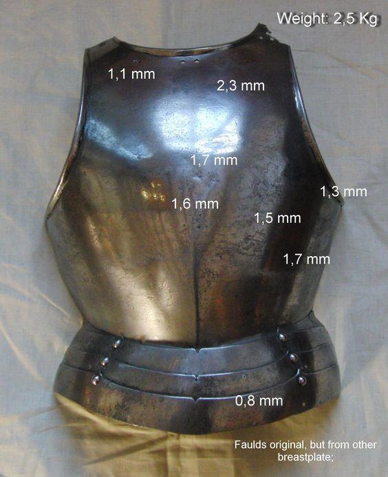 Толщина пластины кирасы в разных местах и её вес. И как мы видим доспех в двух местах пробит.