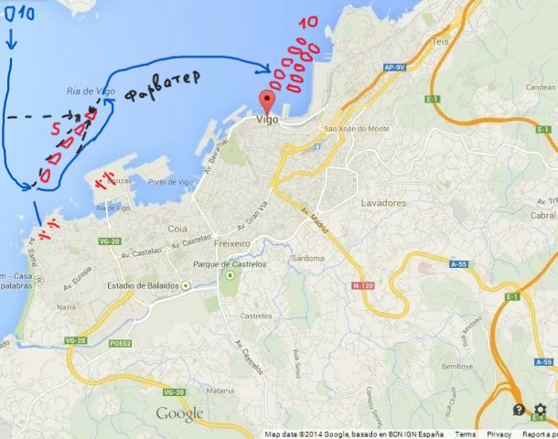 Но англичане отстали, а испанский серебряный флот(десять галеонов) прошмыгнул в порт Виго на разгрузку. Пять боевых испанских галеонов встали в фарватере под защитой своих береговых батарей из шестидесяти 24-фунтовых пушек. Сходу прорваться и взять "серебряных" на абордаж было весьма проблематично. Мы взяли на пойманной шхуне лоцмана с картой и я придумал план.