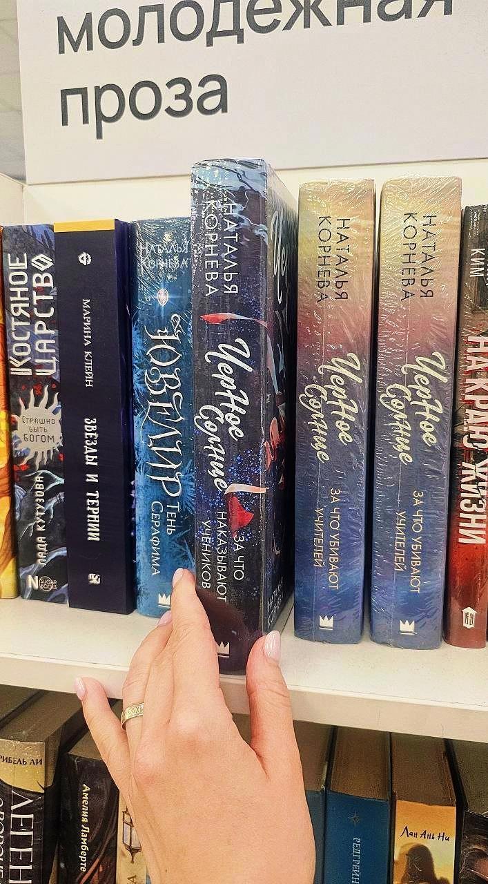 Сразу все мои книги (два тома «Черного Солнца» и «Ювелир. Тень Серафима») замечены на одной полочке книжного магазина!