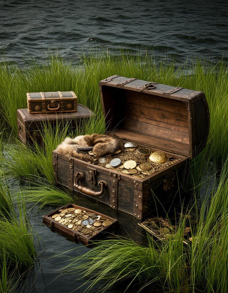 Автор: Светлана КузнецоваКочки с зеленой травой то тут, то там повылазили из-под воды темной, и на каждой стоял то сундучок, то ларь раскрытый с сокровищами, дорогими мехами и тканями, златом-серебром. От бус, венцов, кокошников тонкой работы в глазах рябило. На кустах голых и чахлых висело всевозможное оружие: и ятаганы басурманские, и честные прямые мечи двуручные, колчаны с чудо-стрелами, обязательно в цель попадавшими, а уж всяким ножам да кинжалам счета не было.