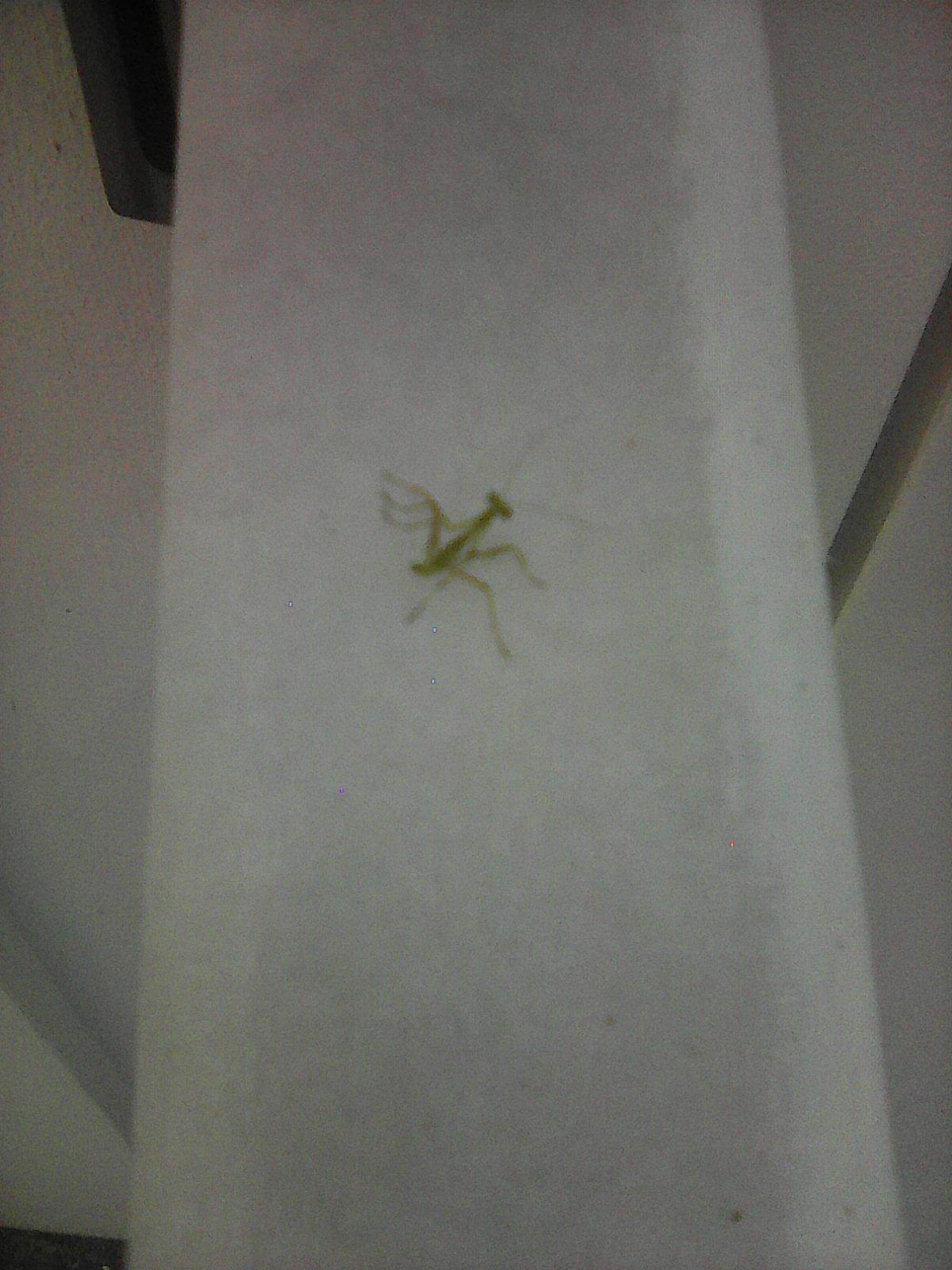 В конце весны на работе покрасили двери. На края дверных проёмов наклеили малярный скотч. Когда краска высохла, то я скотч отодрал. На одной липкой ленте заметил маленького богомола. Насекомое было живо, но хорошо приклеилось и самостоятельно выбраться не могло.