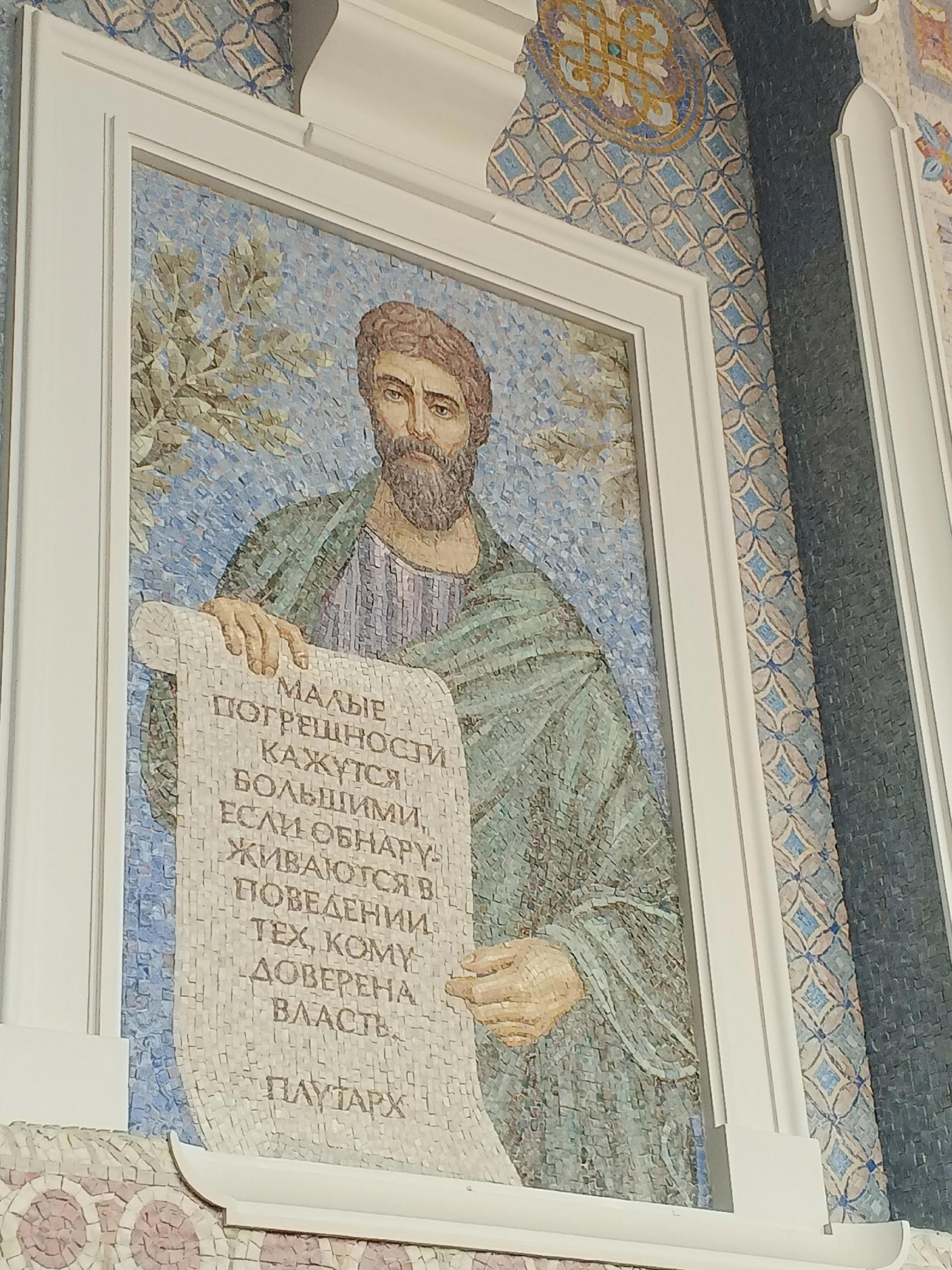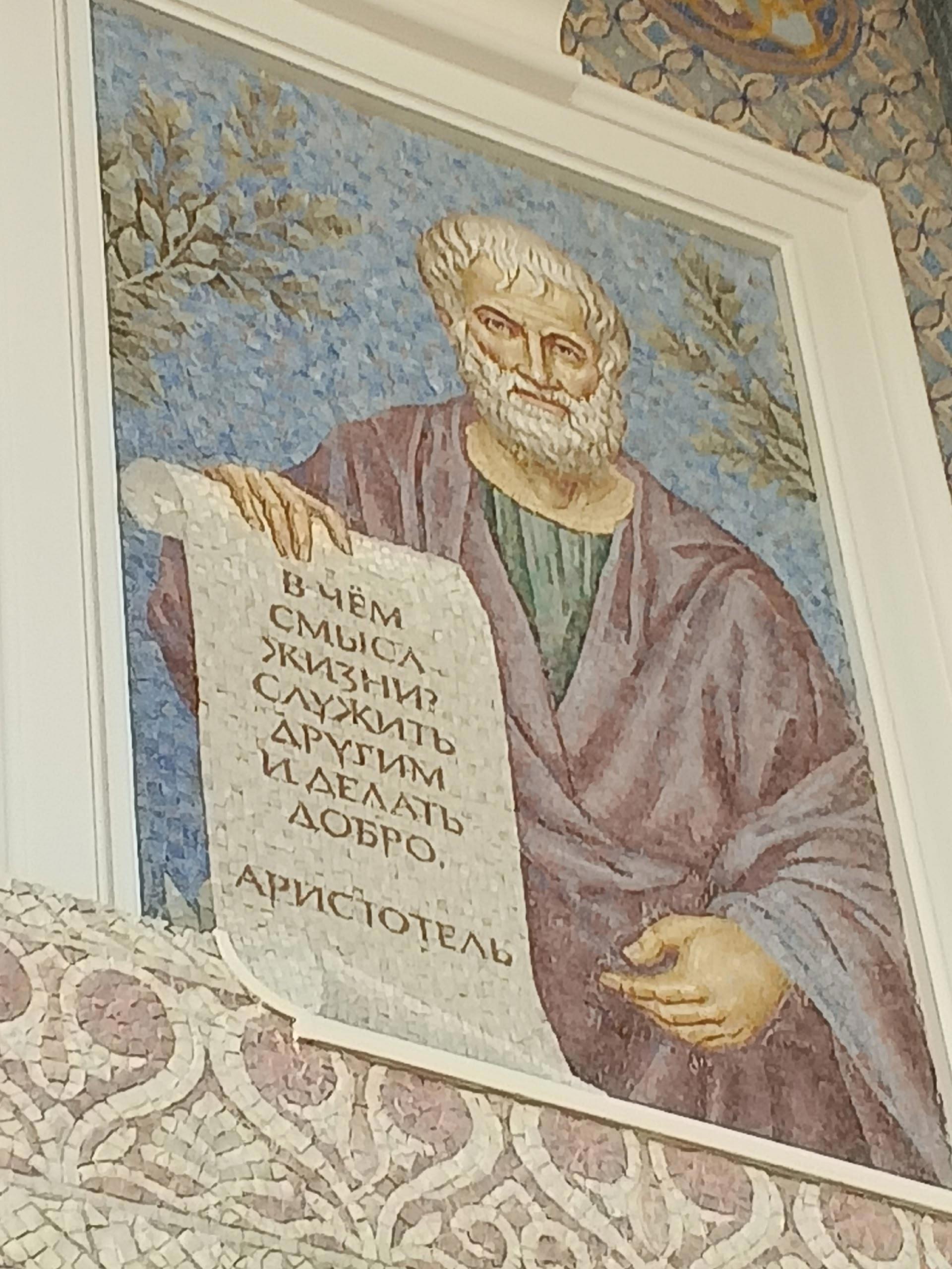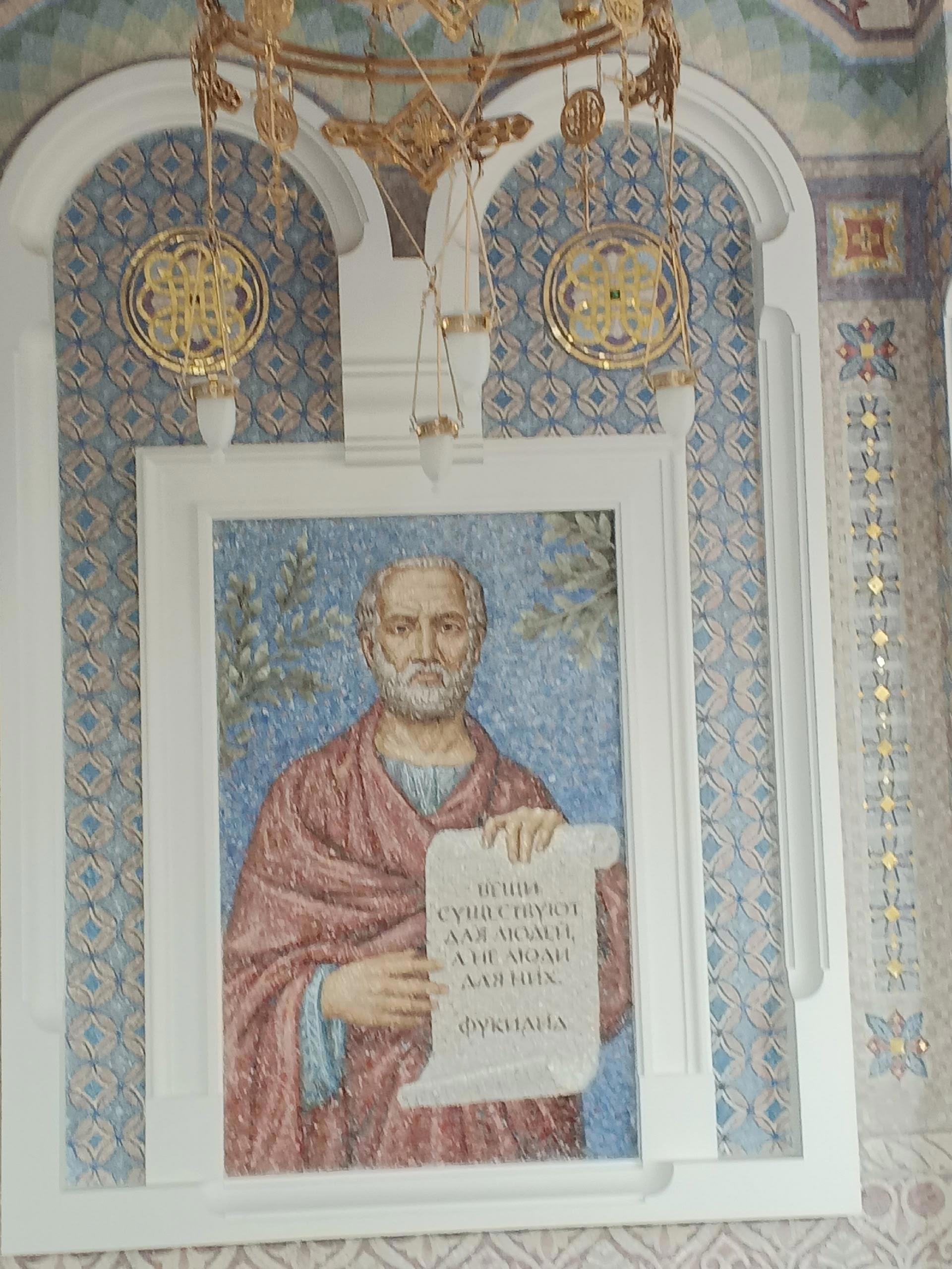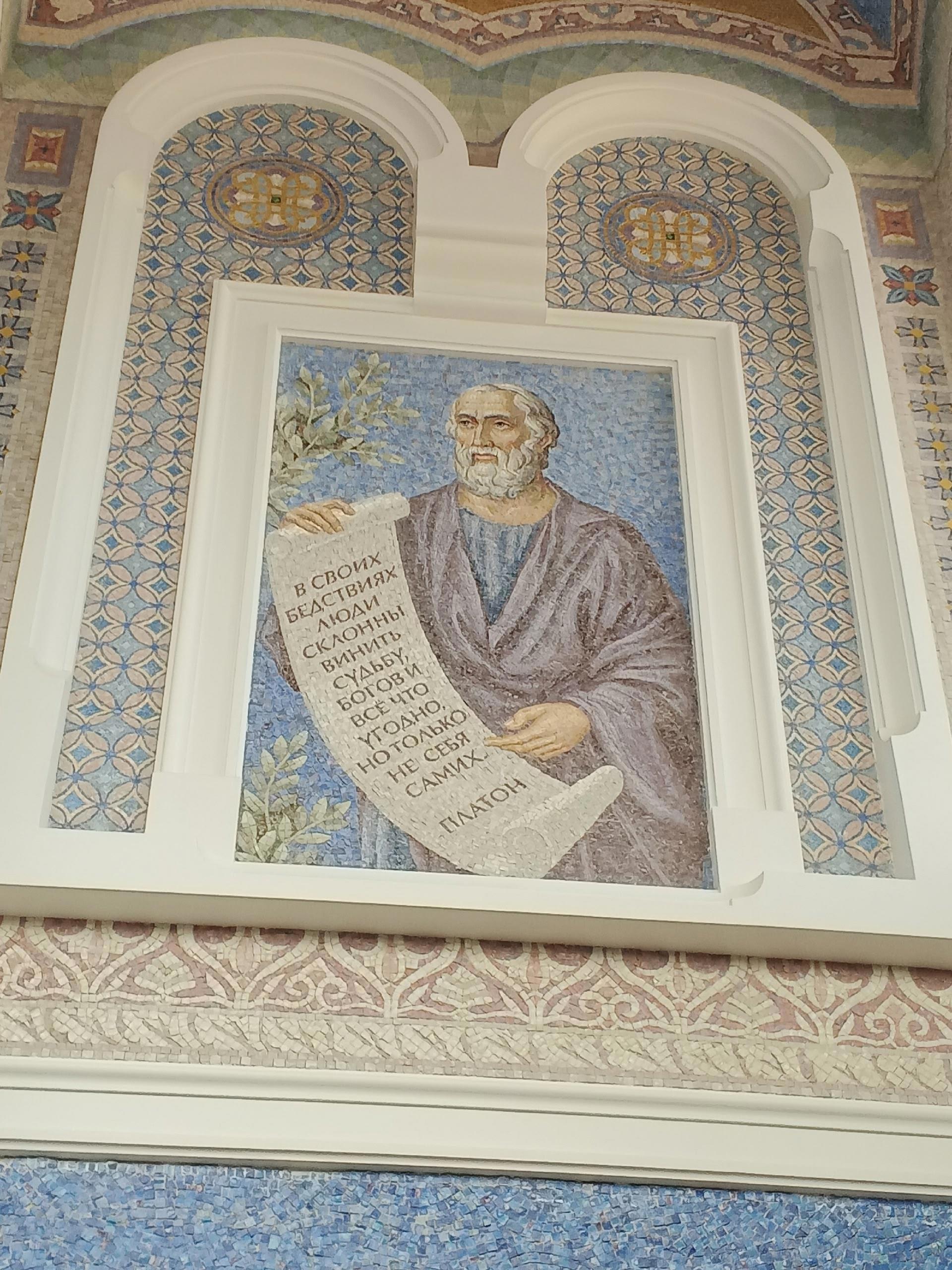 Как вам известно, все люди земли, которые жили до христианства, церковью признаются не познавшими свет истиной веры. Им не попасть в Рай, но они не заслужили и Ада. Для них был придуман Лимб. Место где пребывают души тех, кто не заслужил ада и вечных мук, но не может попасть в рай по независящим от него причинам. Считалось, что в лимбе пребывают души добродетельных людей, умерших до пришествия Иисуса Христа ( лимб праотцов, то есть античных праведников), а также души некрещёных младенцев. И вот этих античных мудрецов с самыми известными их высказываниями мы и увидим на стенах храма, поднявшись практически к самому верхнему храму. Этим, как объяснили нам, хотели показать, как развивалась мысль человека, как постепенно готовилось понимание и принятие прихода Спасителя.