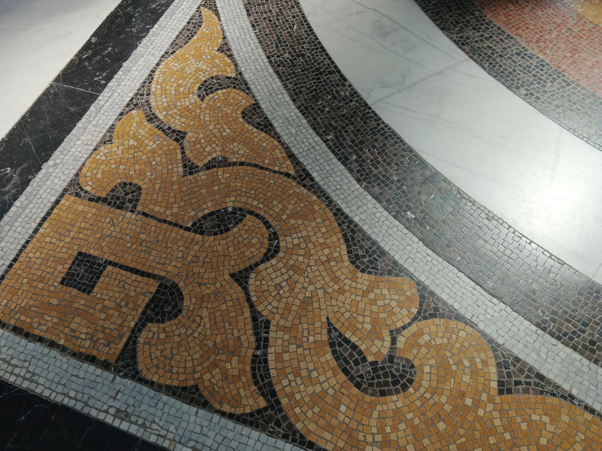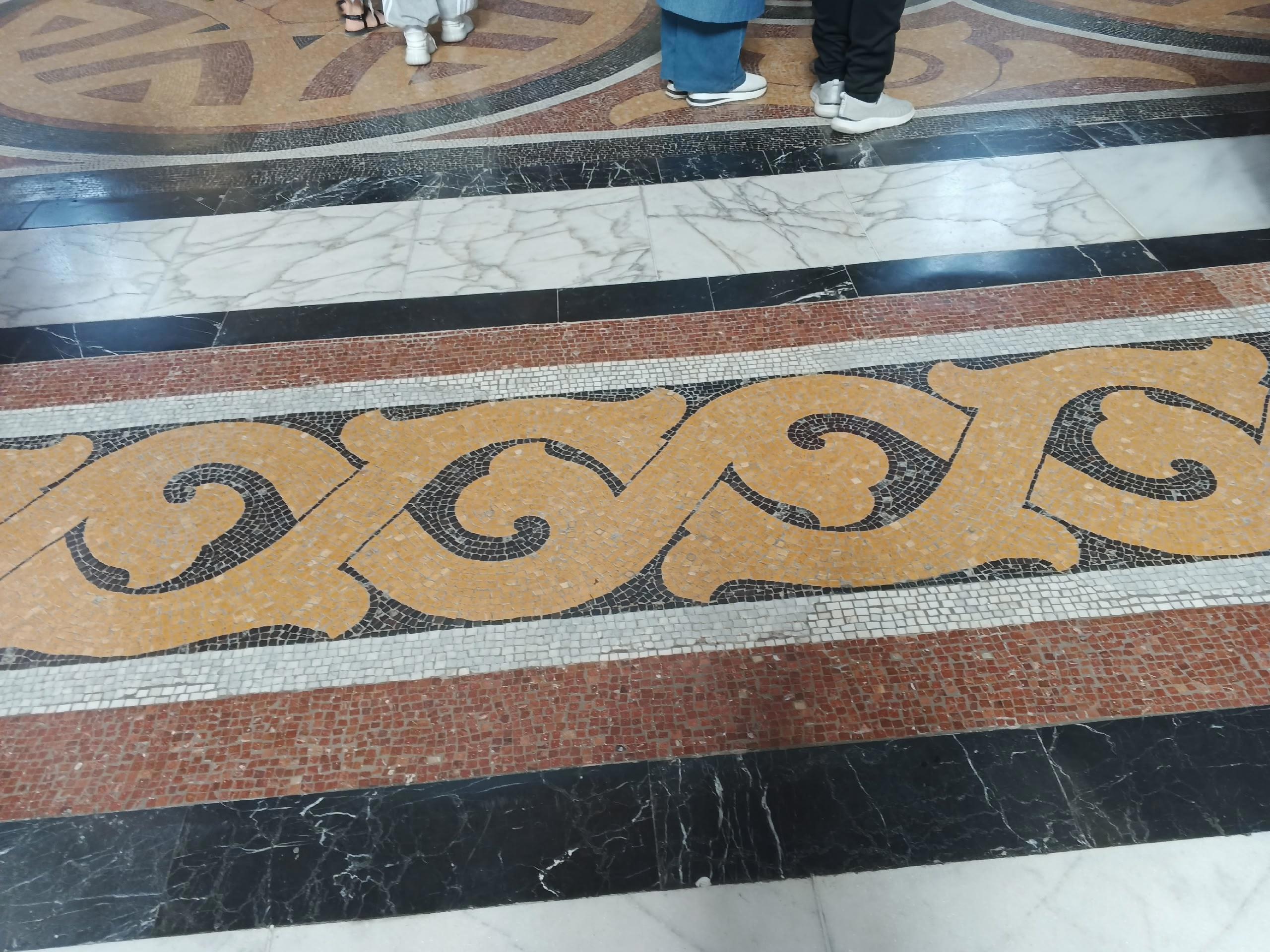 А дальше мы выходим на площадку перед верхним храмом. Здесь, как и предполагалось, есть небольшой столик, где мирно торгуют церковными принадлежностями, ничуть не вспоминая, как Христос изгнал торговцев из храма. Лавку со свечами фотографировать я неи стала, а вот кусочек пола, не удержалась, сняла.
