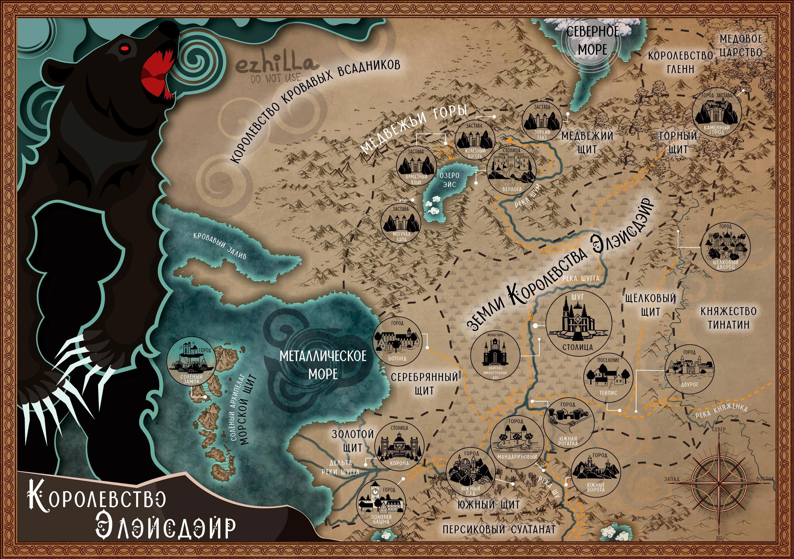 Это на циклы "Королевство семи щитов" и "Королевство без щитов". Я пока не загружала в книги — дописываю историю Глашеньки, но не похвастаться просто не в силах! Это самая первая из серии карт, потом будет на каждую историю своя, +локальные места. Мы впервые увидим все государства, и Королевство Кровавых всадников, и Морской щит, и княжество Тинатин, и Медовое царство, и Персиковый султанат... И более крупно места, где происходили значимые события.