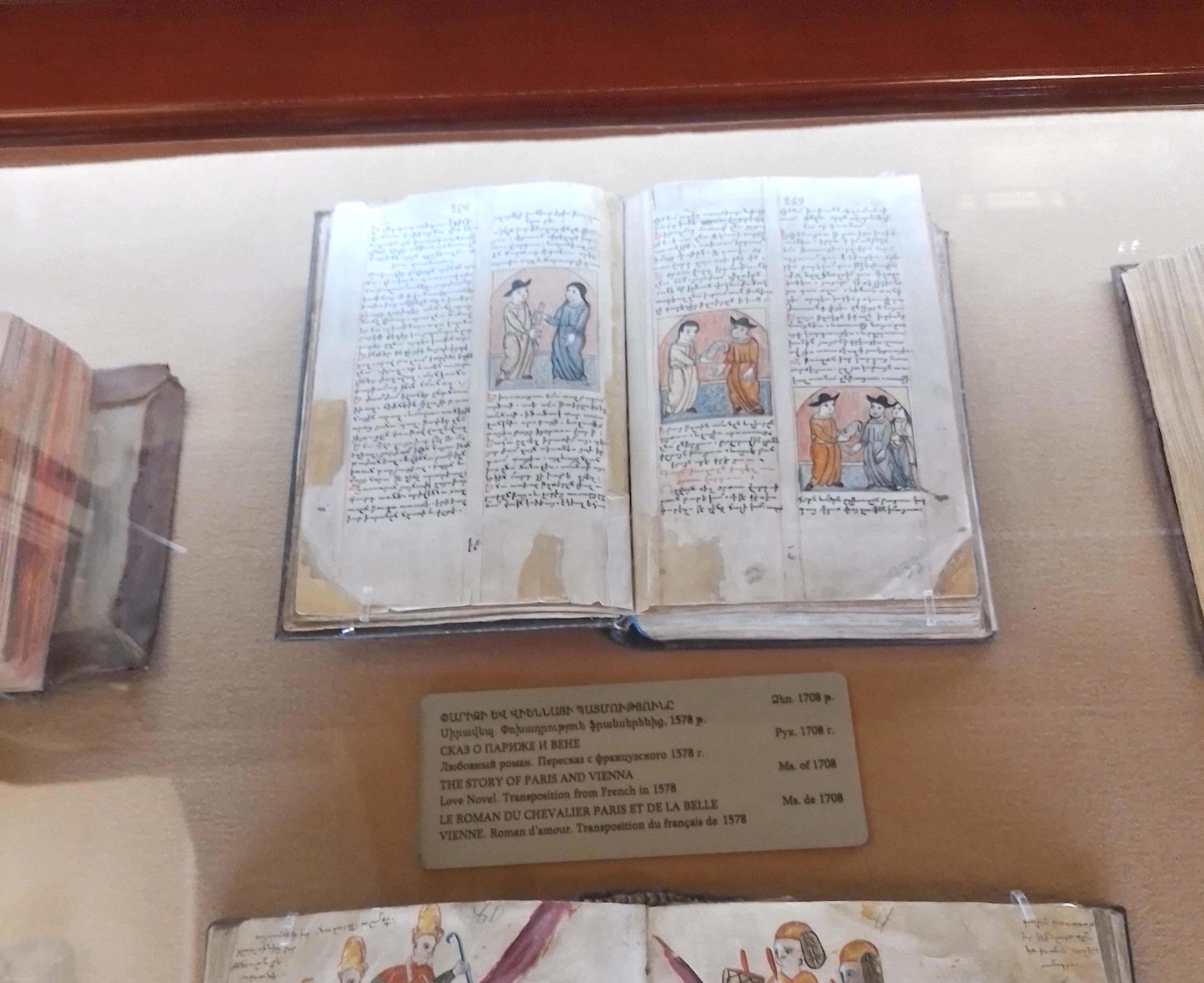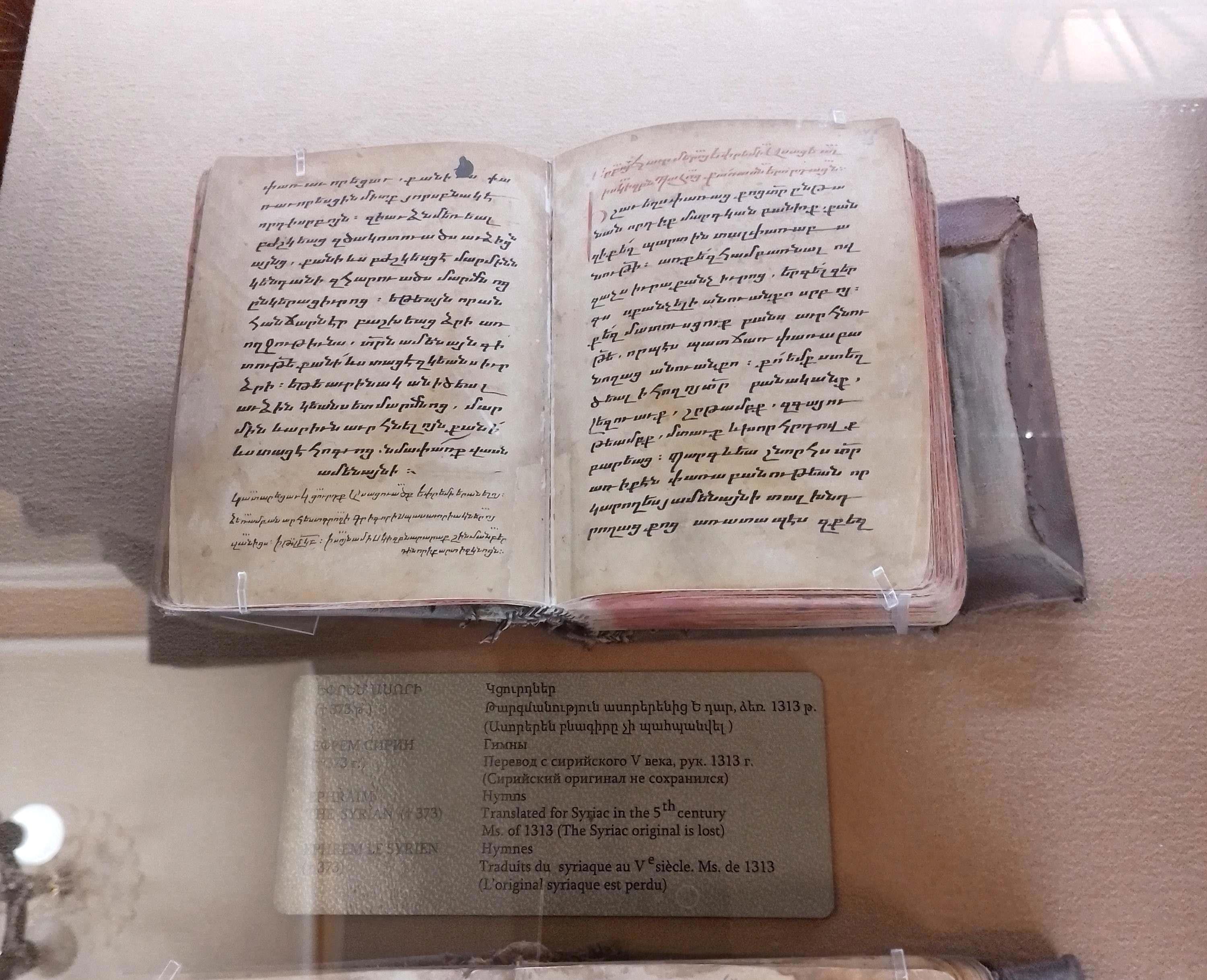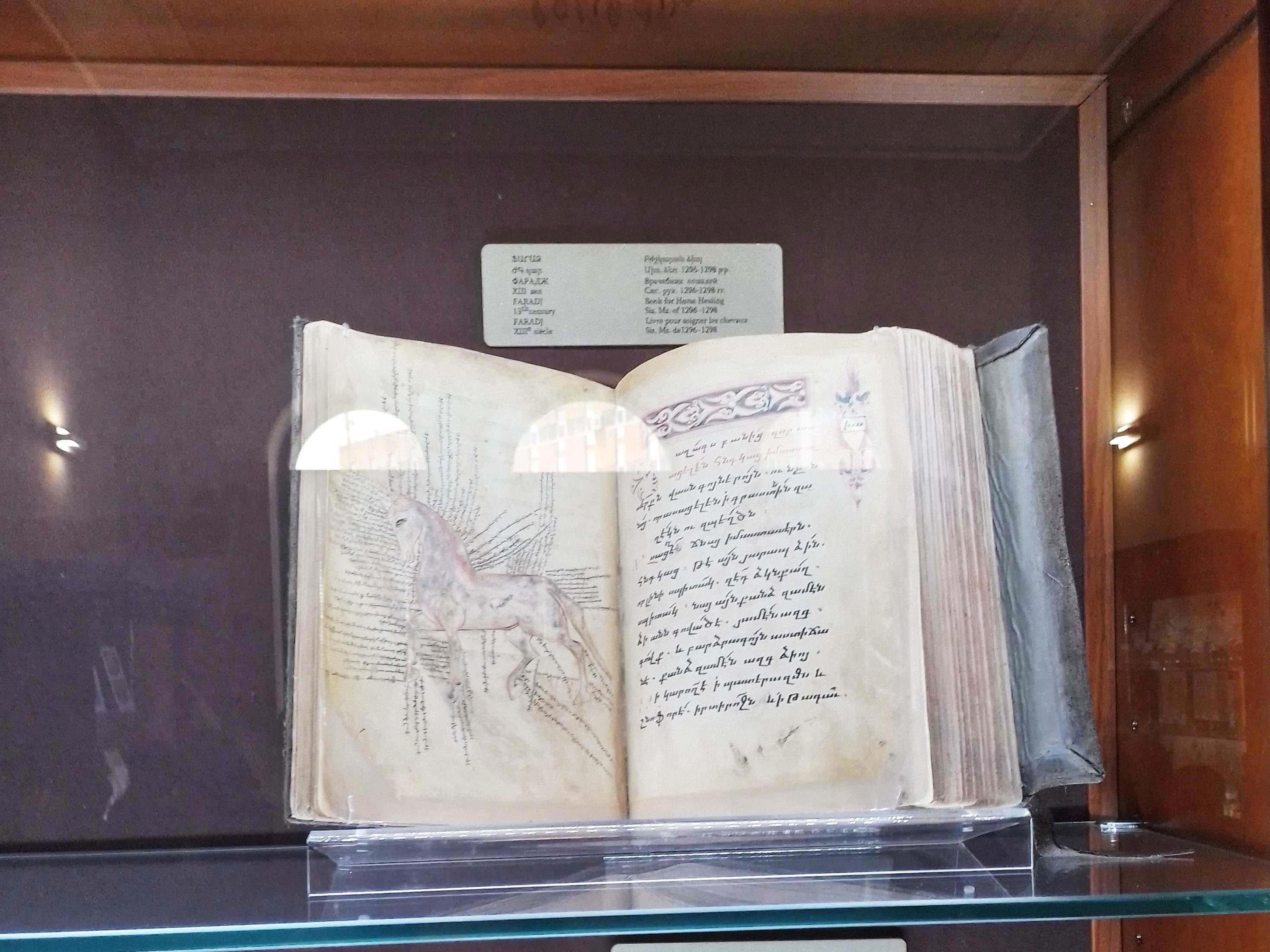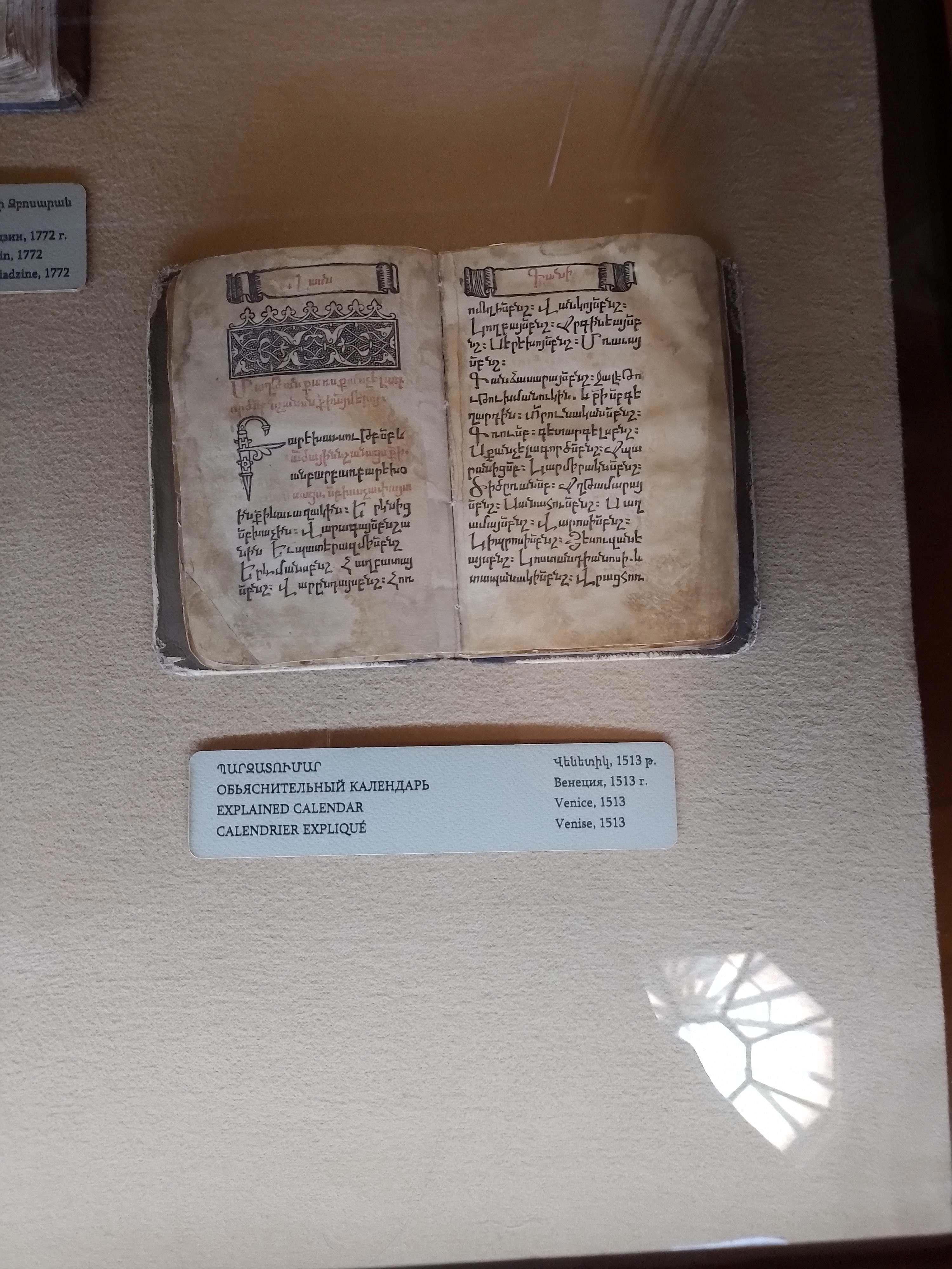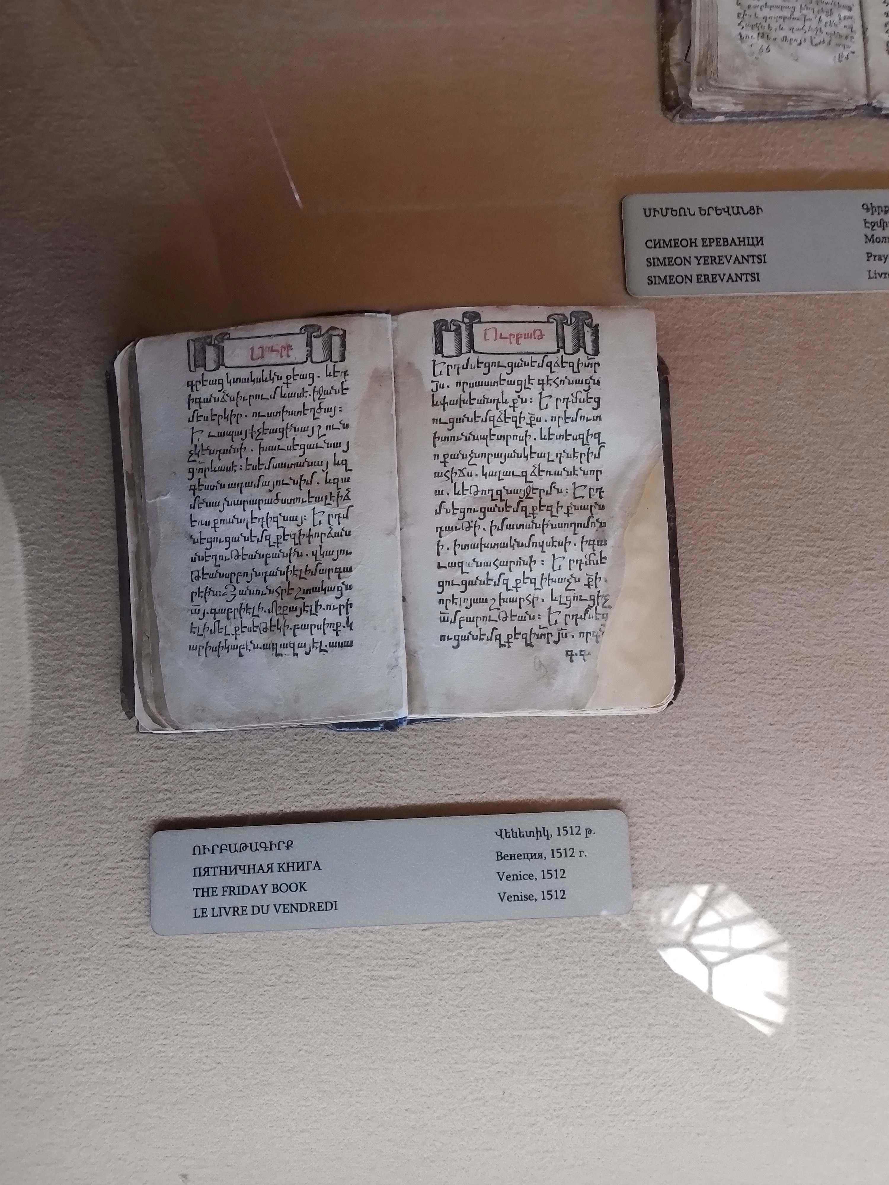 Это первая армянская печатная книга «Урбатагирк» («Пятничная книга»), изданная в Венеции в 1512 году. Священник Акоп Мехапарт (то есть Акоп «Грешный»), издавший книгу, напечатал в ней пять самых простых и практичных вещей, которые любая армянская хозяйка того времени захотела бы иметь у себя дома. Это календарь, сборник самых распространенных церковных песнопений, домашний лечебник, гороскоп и краткий перечень церковных праздников. То есть, то, что на его взгляд можно продать, и то, что купят и будут хранить у себя дома.
