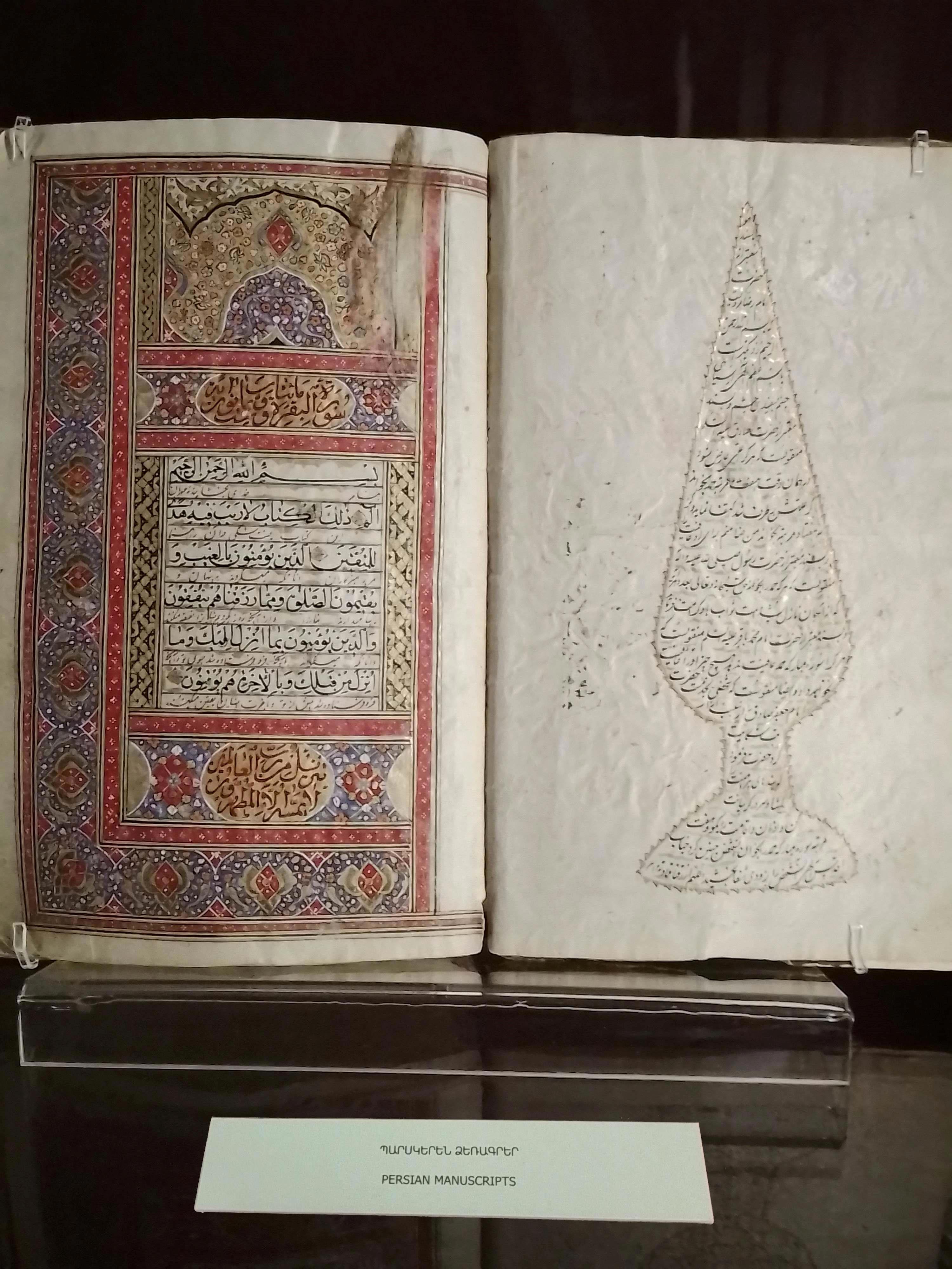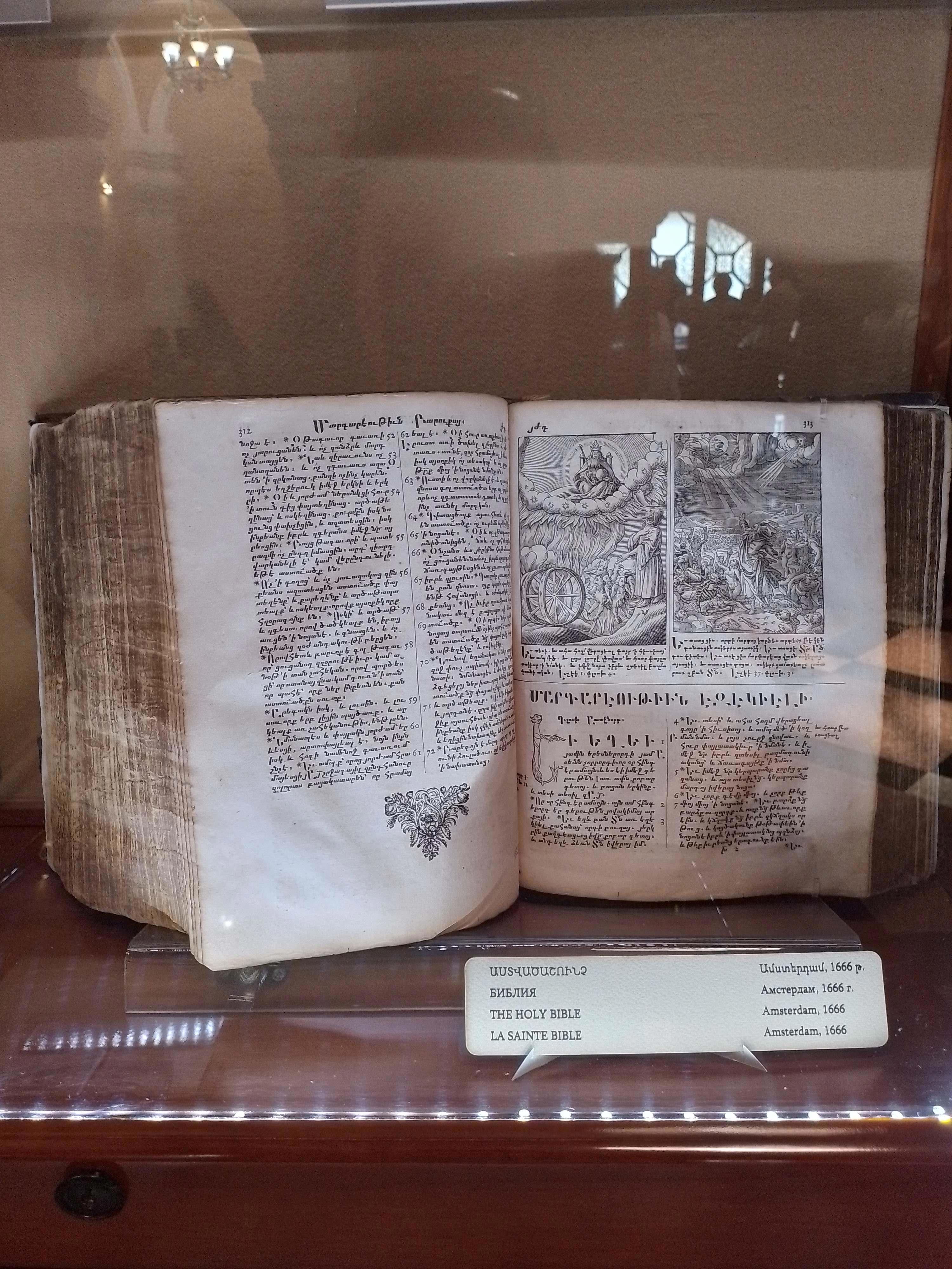 А это первая Библия на армянском языке, напечатанная в 1666 году учёным монахом и книгопечатником Восканом Ереванци (Восканом Ереванским) в основанной им в Амстердаме типографии. Книга вышла огромным для того времени тиражом — 5000 экземпляров. Две книги из тиража были особенными: вручную был сделан переплет, а на обложке была изображена Богоматерь с Иисусом Христом на руках. Эти Библии были преподнесены французскому королю Людовику XIV и Папе Римскому Клементу IX. На сегодняшний день, один из этих экземпляров хранится в национальной библиотеке Франции.