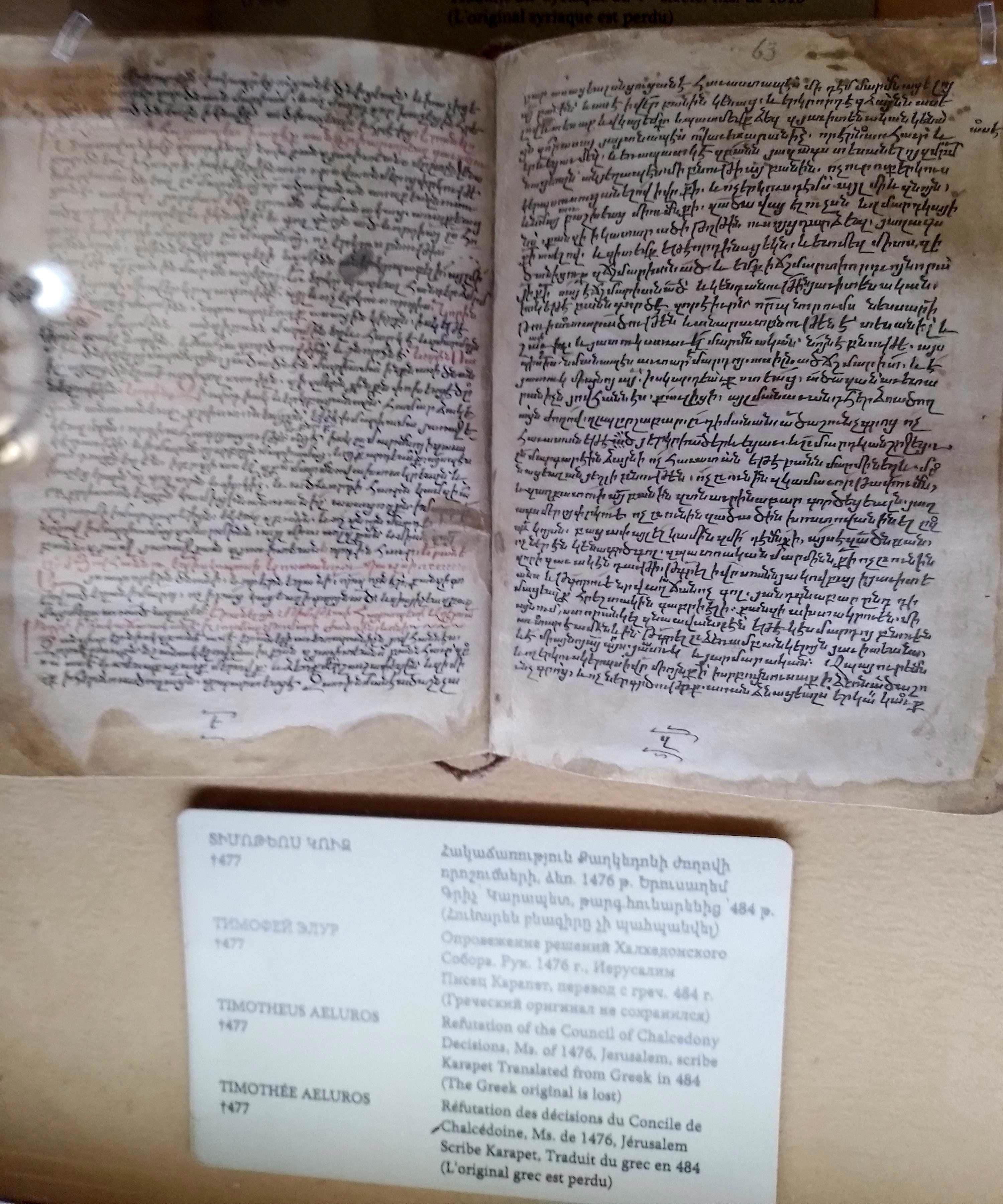 Тимофей Элур. «Опровержение решений Халкидонского собора» («Возражения к определениям собора в Халкидоне»). Рукопись 1476 года, Иерусалим. Эта рукопись, причем целиком, сохранилась лишь в армянском переводе. Греческих оригинальных текстов не сохранилось вовсе, что указывает на то, что богословское наследие патриарха Тимофея Элура было уничтожено сторонниками Халкидонского собора. Этот труд является основательным и важным источником по вопросам внутрицерковной жизни той эпохи, по вопросам борьбы за вероисповедание. В нём излагаются исторические события, произошедшие вокруг соборов в Эфесе (449 г.) и Халкидоне (451 г.), рассказывается о гонениях против несогласных с имперской политикой насаждения халкидонизма и другие факты. «Возражения» демонстрируют официальную позицию противников Халкидонского собора в Александрийской церкви.