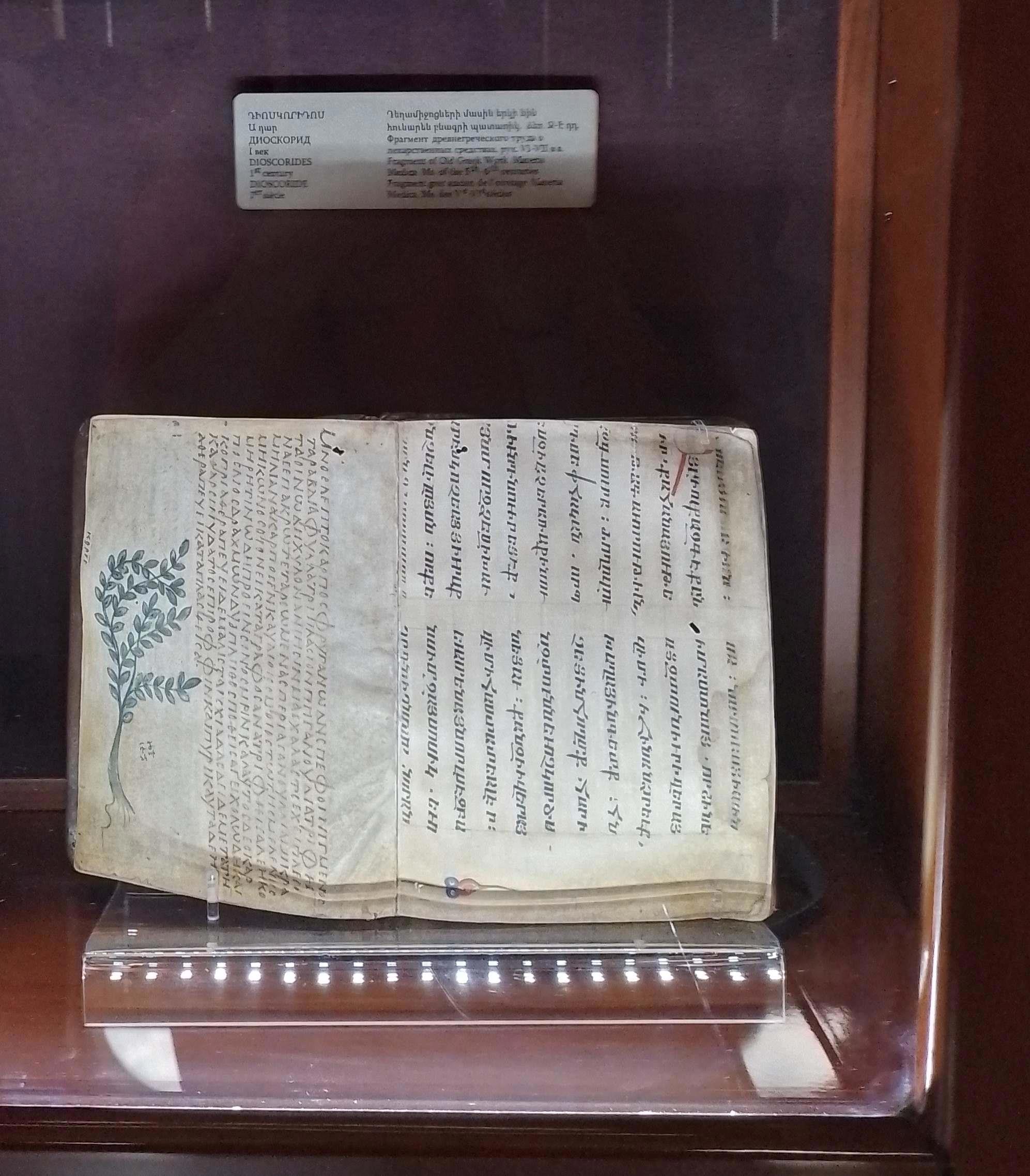 Фрагмент труда древнегреческого врача и ботаника Диоскорида (I в.) о лекарственных средствах. Рукопись VI–VII в. Текст как на древнегреческом, так и на армянском.