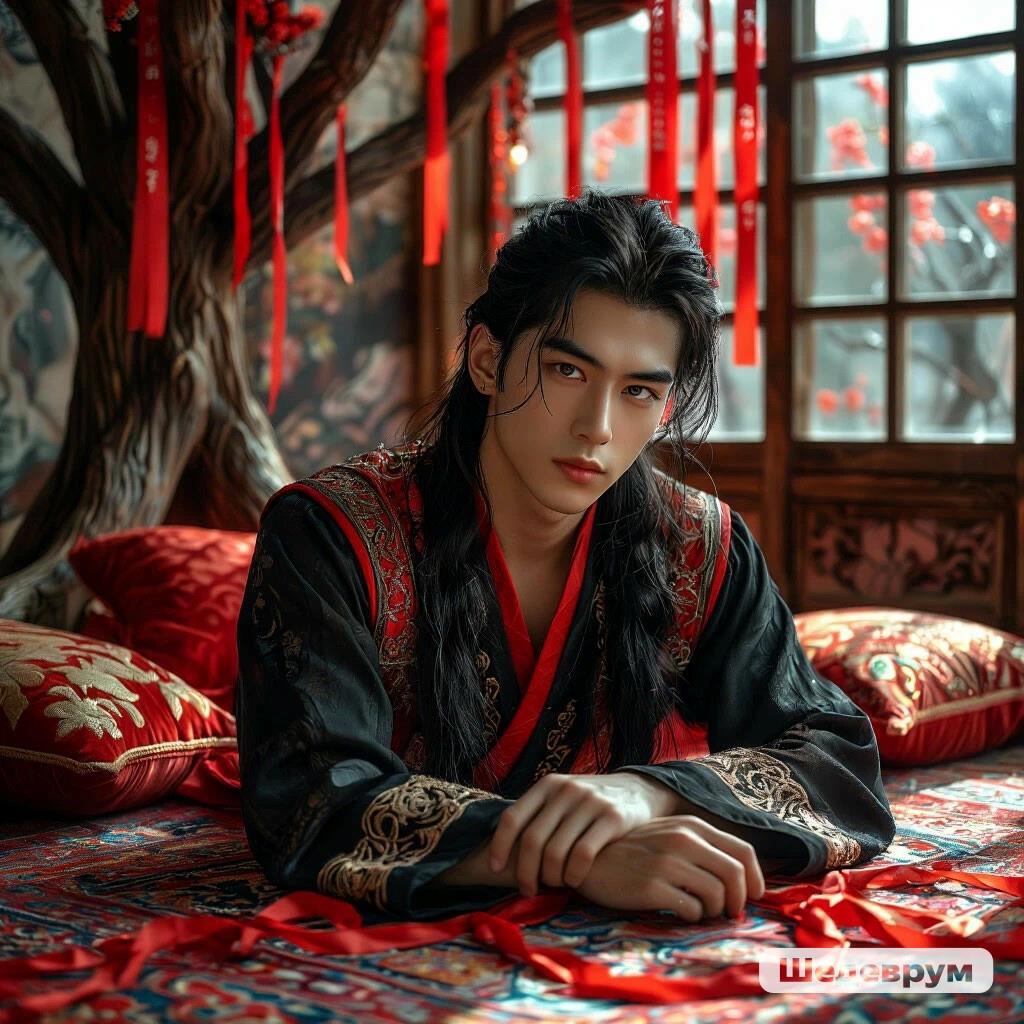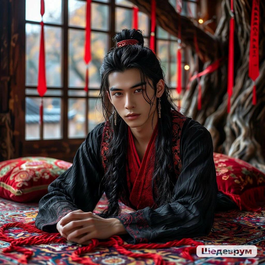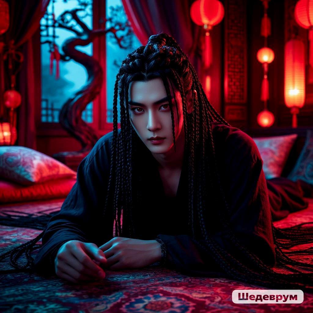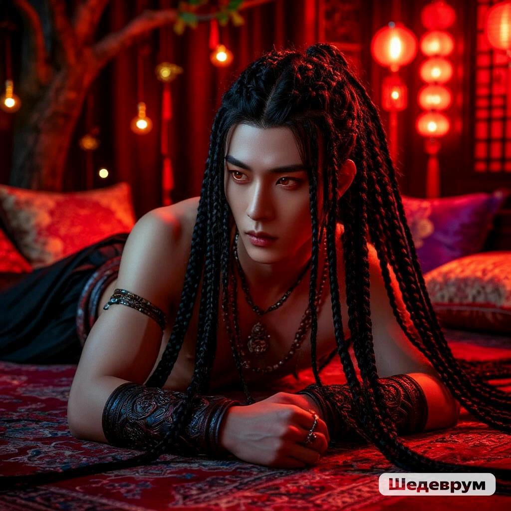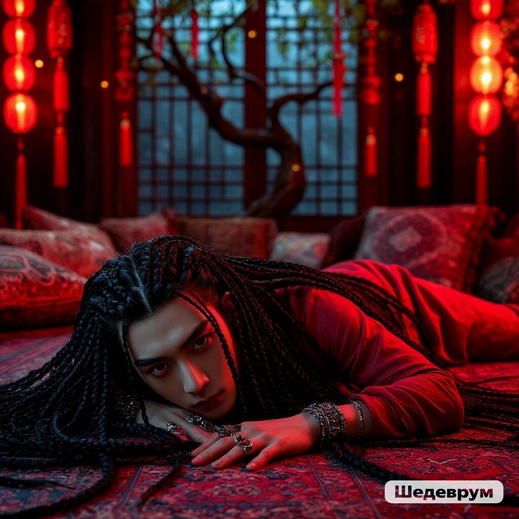 "очень красивый парень, утонченные черты лица, длинные черные волосы заплетены в много тоненьких косичек, неоновый отлив волос, и большие глаза, в стиле Китая, оттенки красного, Дарк фэнтези мир, эстетично, красиво, реалистично, профессиональное фото, высокая детализация, 5d, много огней, комната с коврами и подушками, за окном большое древо с лентами, парень лежит на животе, видно тело, украшения"