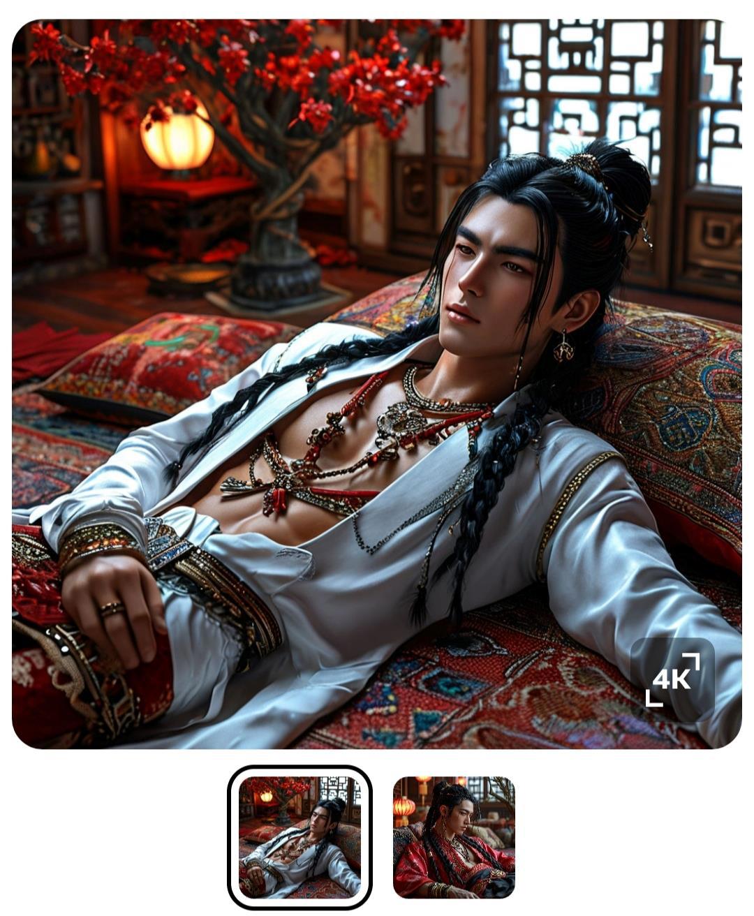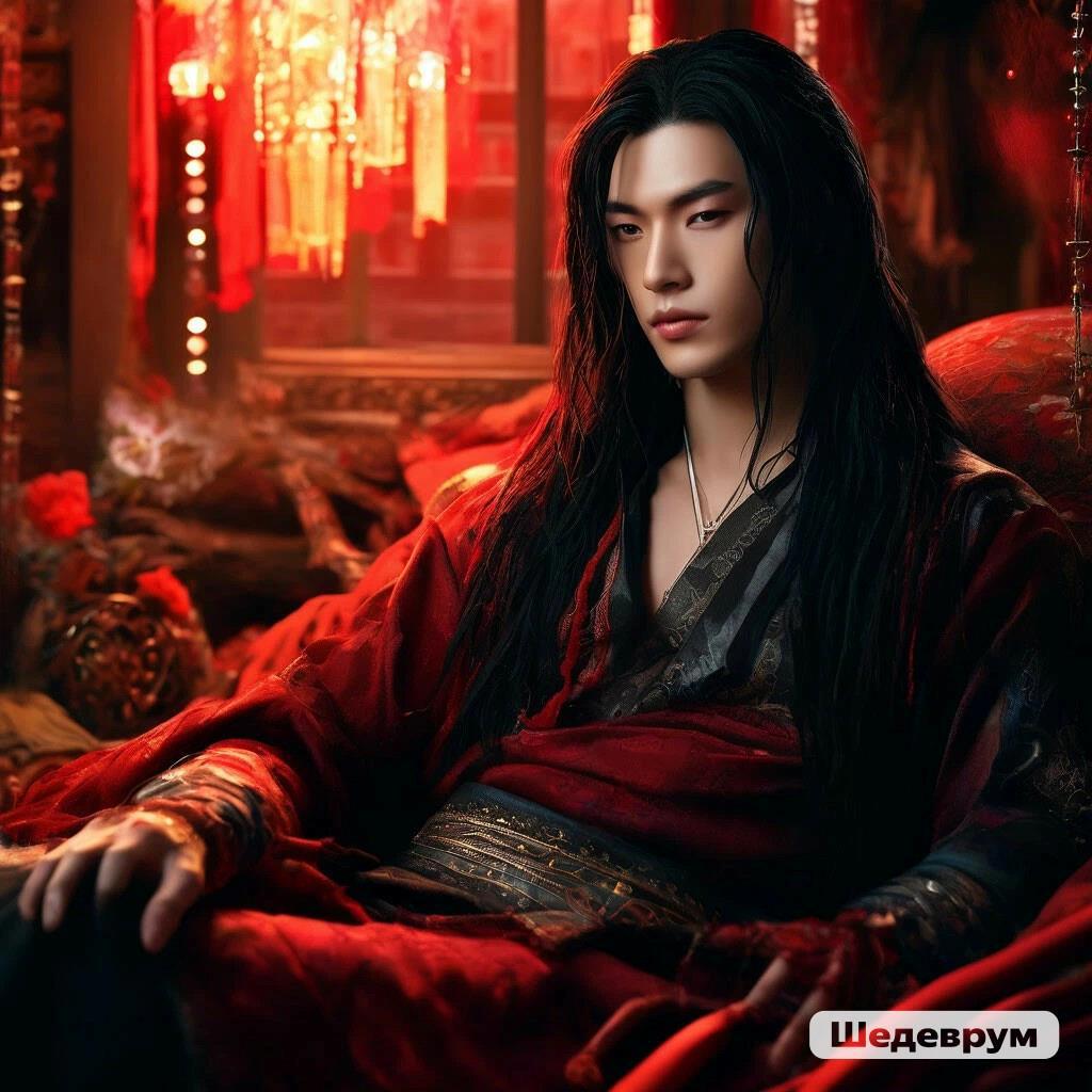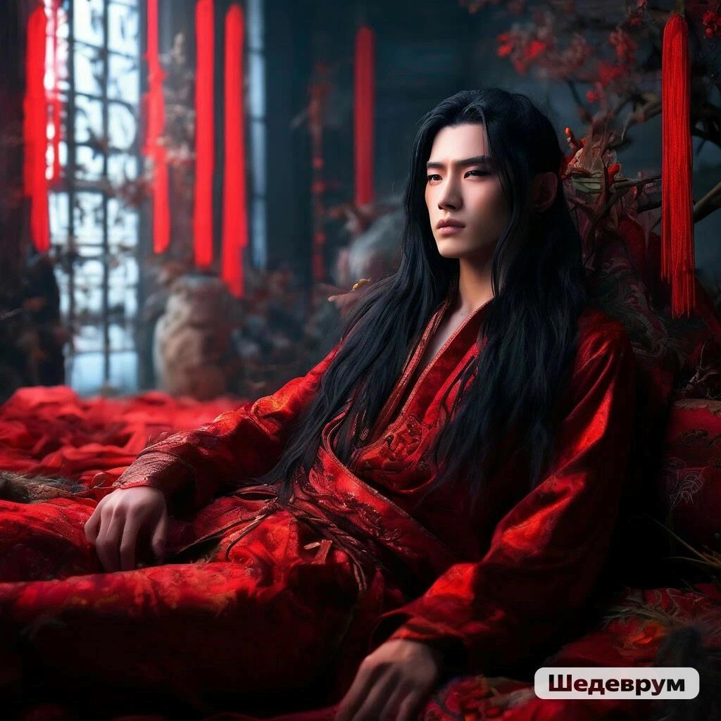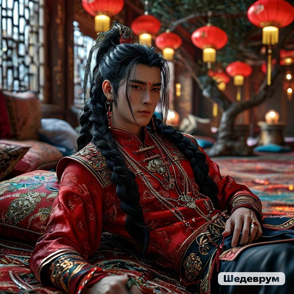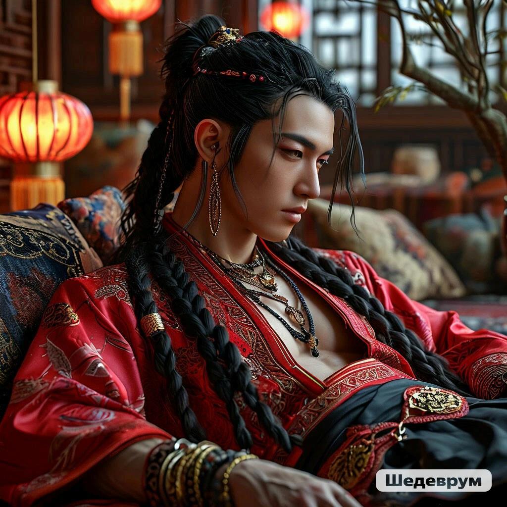 "очень красивый парень, утонченные черты лица, длинные черные волосы заплетены в много тоненьких косичек, неоновый отлив волос, и большие глаза, в стиле Китая, оттенки красного, Дарк фэнтези мир, эстетично, красиво, реалистично, профессиональное фото, высокая детализация, 5d, много огней, комната с коврами и подушками, за окном большое древо с лентами, парень лежит на животе, видно тело, украшения"