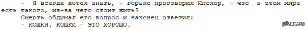 Сразу извиняюсь, что не выложу ссылку на первоисточник - он затерялся где-то в истории браузера, а гугл выдает совсем не то что ищу. Но не суть важно. Важнее, что я весьма любил читать Пратчета. особенно его темный жнец СМЕРТЬ мне понравился. и конечно кошки...