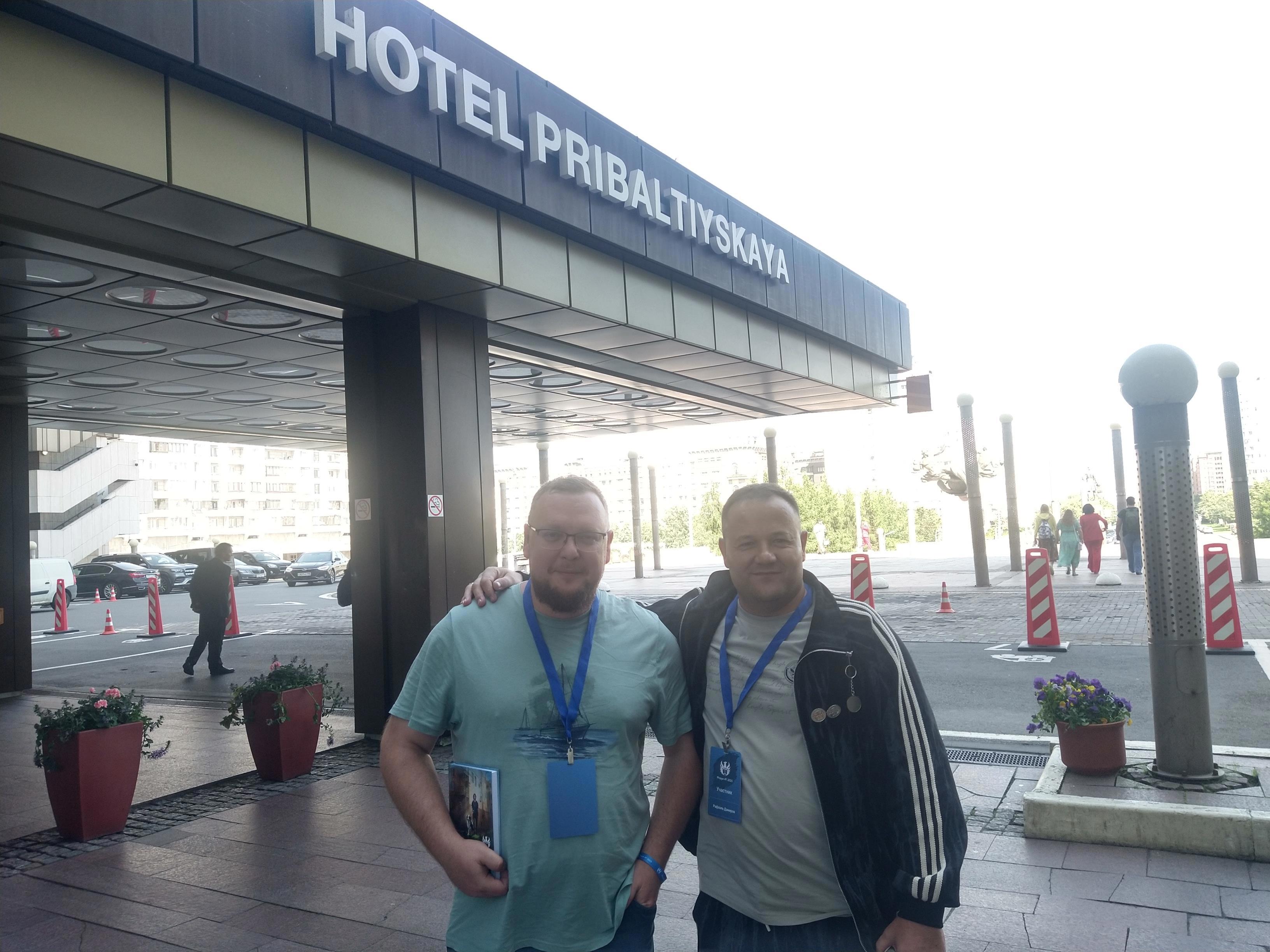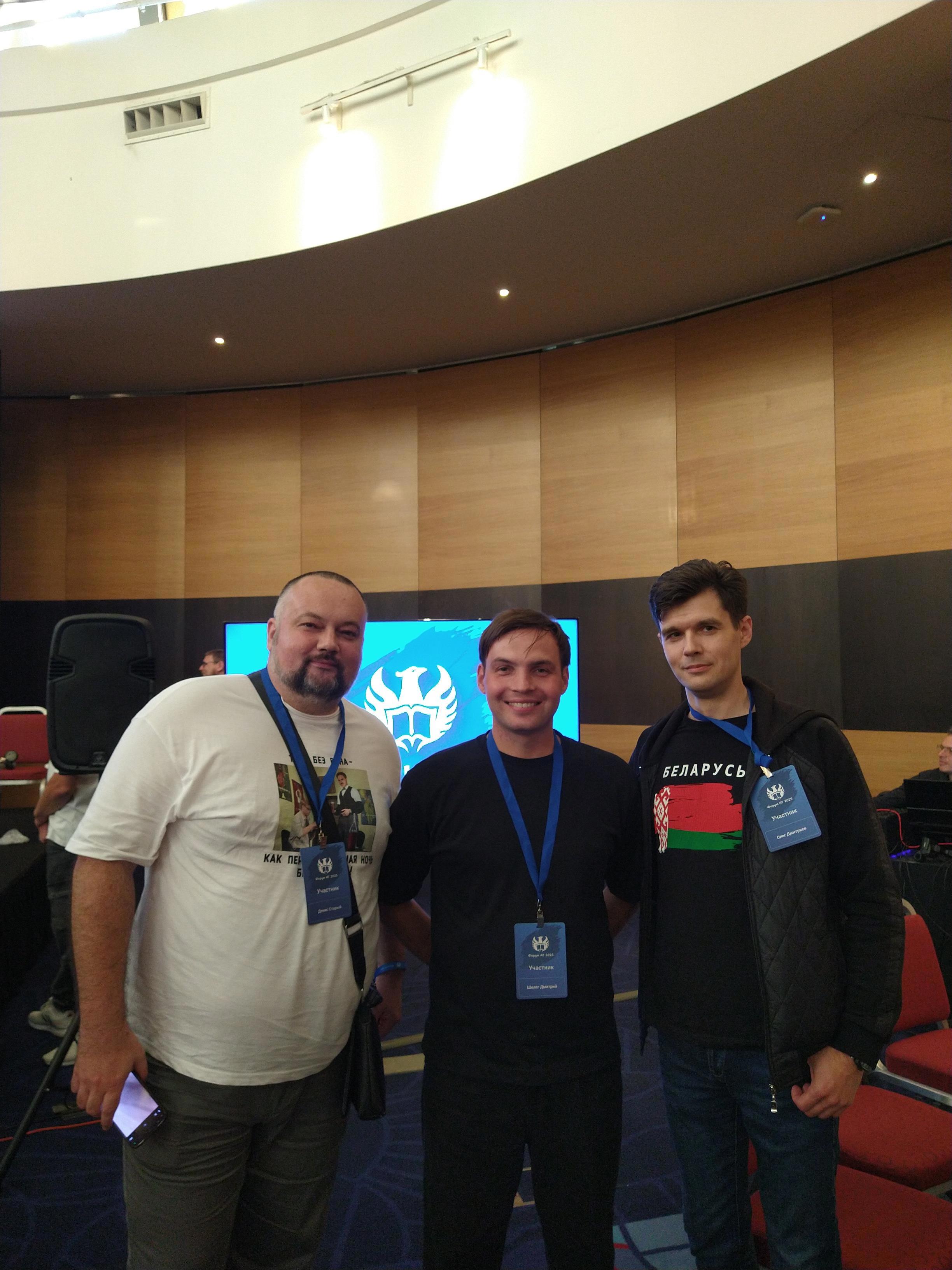 Потом, воспользовавшись случаем и тематически подходящей футболкой, познакомился с замечательным автором Димой Шелегом. И практически тут же познакомил с ним Дениса Старого. Писатели из Гомеля никак не могли встретиться-познакомится дома, и Вселенной пришлось кинуть в них мной, голубем мира))