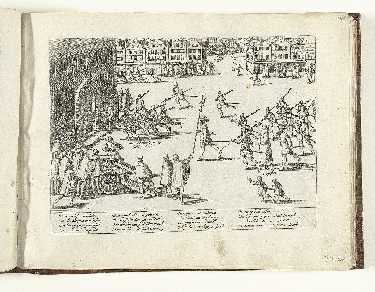 А знаете, что за гравюра ниже? Это изображение ареста Роблеса, которого арестовали и выставили из Гронингена собственные солдаты. Он так опротивел всем жестокостью (а еще не выплачивал жалованье), что его просто выставили вон. Его власть в Гронингене закончилась!