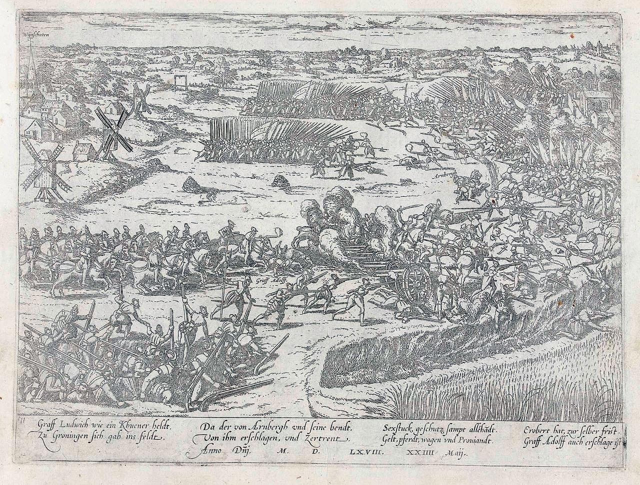 Кстати, ниже гравюра одного из сражений, в котором участвовал Роблес. Испанцы были разбиты младшим братом Вильгельма Оранского Людвигом Нассау. Правда, в следующем сражении разбит был уже Нассау.