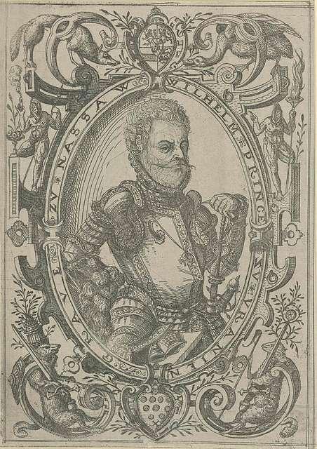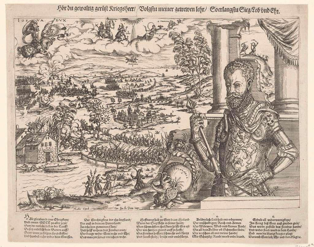Матис Зундт – Благочестивый генерал Оранский в сравнении с Иисусом Навином, 1569. На переднем плане стоит принц Вильгельм I в доспехах и с жезлом командующего в руке; позади него его армия переправляется через Маас, октябрь 1568 года. Рядом с ним шлем с надписью Prudentia (Осторожность). На заднем плане – битва с испанской армией. В небе слева – Иисус Навин на коне, в центре – собранные добродетели в облаках, а Superbia (Гордость) падает с неба. Над гравюрой – название, а под ней – подпись из пяти пронумерованных стихов по шесть строк каждый на немецком языке.