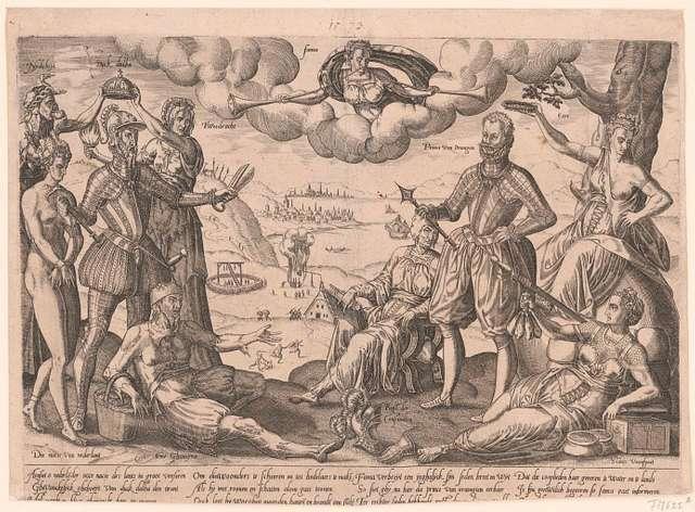 Герцог Альба и принц Оранский стоят лицом к лицу. Альбу сопровождают Раздор и Зависть. Он ведёт обнажённую женщину в кандалах – Нидерланды. Народ, олицетворённый бедняком, лежит у его ног. У Вильгельма Оранского есть и другие союзники: Честь, Богатство и Чистая Совесть. Послание ясно: только он может восстановить мир и процветание.