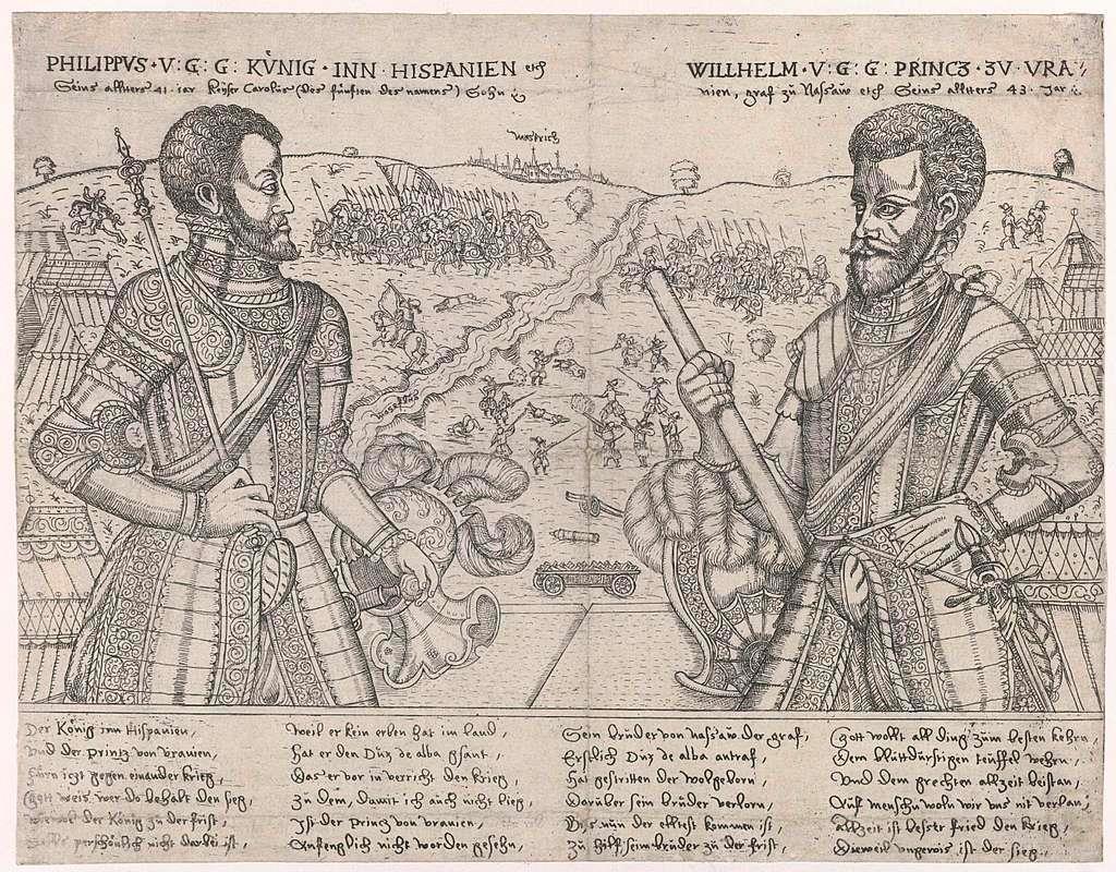 Филипп II против Вильгельма I. Поясное изображение в доспехах, на заднем плане — армии Оранского, переправляющиеся через Маас, и Маастрихт вдали, октябрь 1568 года. С подписью из четырех стихов по шесть строк на немецком языке.