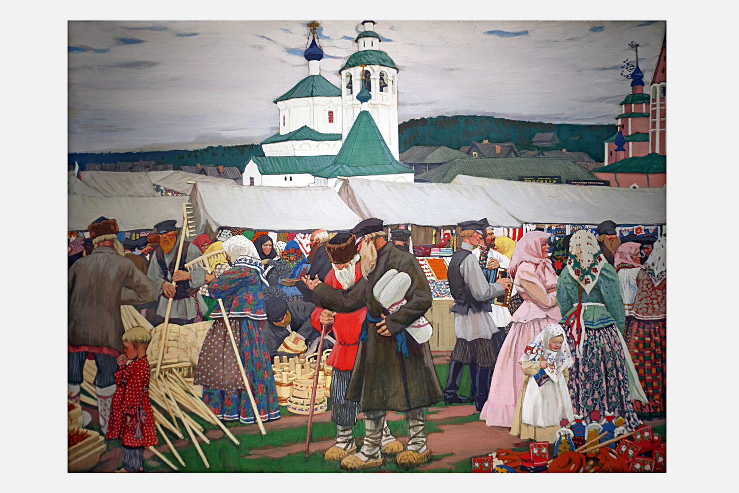 Безмолвная красота пейзажей, зимние кружева, птицы-тройки, летний зной, свежий простор волжских берегов обрамляли задумчивую негу семейных портретов, торжественную церемониальность чаепитий, раздолье ярмарок и гуляний. Купцы, мещане, седовласые степенные старцы, бойкие девицы, взрослые и дети, семья и многочисленные портреты современников — узнаваемый стиль и потрясающая самобытность художника еще при жизни была отмечена зрителями.